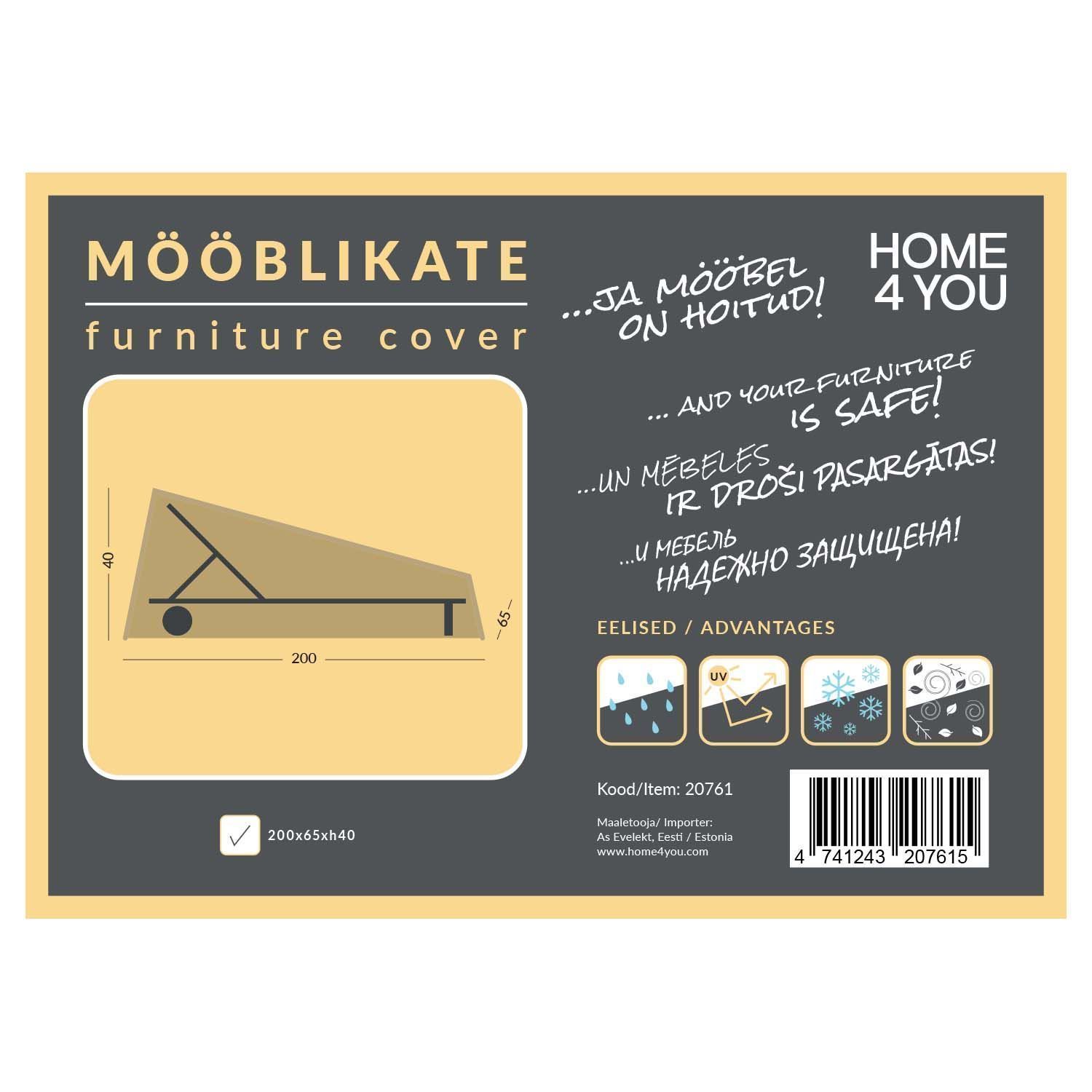 Mööblikate 200x65x40cm, ilmastikukindel. Mööblikate hoiab aiamööbli puhta ja kuivana ning alati kasutusvalmis. Mööblikate on valmistatud vetthülgavast lamineeritud polüesterkangast. Teibitud õmblused ei lase vett sisse ja õhuavad vähendavad aurude kondenseerumist katte all. Katte alumises servas on nöör, mille abil saab katte vajadusel kokku tõmmata ja kinnitada nii, et see püsib ka tugeva tuulega paigal. Materjali tehnilised andmed: kaal 155±8 g/m², paksus >0.20 mm, veekindlus ? 6000mm, vetthülgavus 4, värvi valguskindlus 6, UV kaitse 600 ± 5 tundi, hingavus 150-200 g/m²/24h, temperatuuri taluvus -30 kuni +80°C. TÄHELEPANU! Mööblikate aitab pikendada mööbli eluiga ning on turvaline kaitse välimööblile, kuid ei taga samasuguseid tingimusi nagu siseruumides hoiustamine. Tugeva vihma korral võivad kattega kaetud mööblile koguneda veelombid. Eemaldage kogunenud vesi esimesel võimalusel. Peske katet vastavalt tootele kinnitatud hooldusjuhendile. Mööblikatte kasutamine ei ole sobiv lahendus aiamööbli ületalve õues hoidmiseks.