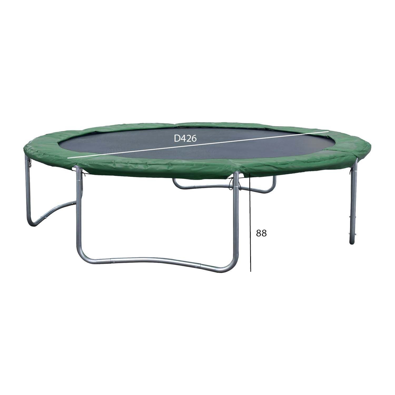 Batuut D426xH88cm, rohelise äärega. Batuut on tore võimalus värskes õhus aktiivseks ajaveetmiseks kogu perele. Batuudi kõrgus maast on 88cm. Elastne ja vastupidav hüppematt on valmistatud musta värvi polüpropeenist. Turvaääre pealmine kiht on valmistatud rohelisest PVC materialist, alumine pool on polüetüleenkangas. Kahe kihi vahel on 15+6mm polüetüleenvahust pehmendus. Turvaääre laius on 27cm. Batuudi raam ja jalad on valmistatud galvaniseeritud terastorust. Ülemise ääre toru mõõt on D45x1,5mm, jalatorude mõõt on D38x1,5mm. Batuudil on 88 vedru - 138mm/D25x3,2mm. Kaalupiirang 180kg. Turvalisuse tagamiseks soovitame batuudile juurde osta HOME 4 YOU turvavõrk koodida 09414. Pika kasutusaja ja ilmastikutingimuste mõjul kulunud batuudi osad on võimalik välja vahetada. Varuosadena on saadaval, turvavõrk, turvaäär, hüppamismatt ja batuudivedrud. HOIUSTAMINE: batuudi eluea pikendamiseks soovitame see suvehooaja lõppedes lahti monteerida ja hoiustada kuivas, hea ventilatsiooniga ruumis. Puhastage ja kuivatage matt ja turvaäär enne hoiule panekut.