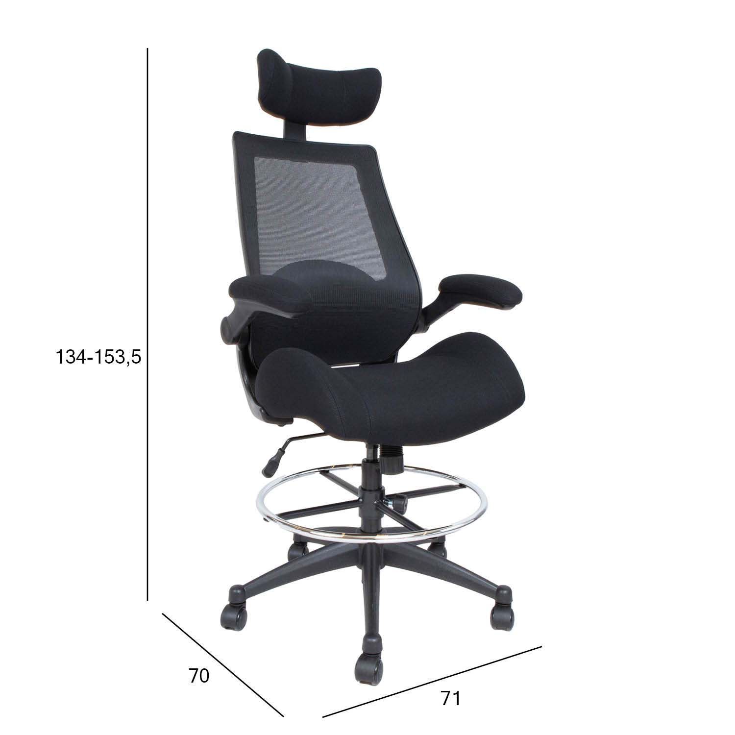 Kõrge töötool MILLER must. Mugava töötooli voolujooneline iste on vormitud vastupidavast polüuretaanvahust. Iste ja seljatugi kaetud polüesterkangaga, Martindale'i väärtus 30 000. Selja nimmeosa toetab kehakuju järgiva vormiga pehme padi seljatoe taga. Toolil on kiikemehhanism. Kiikejäikus on reguleeritav vastavalt istuja kaalule. Istme kõrgus reguleeritav gaasamordi abil. Plastikust käetoed on polsterdatud ja kaetud polüesterkangaga. Käetugesid on võimalik üles tõsta. Peatugi on vabalt kallutatav, peatoe kõrgus on reguleeritav. Terasest jalatoe kõrgus on reguleeritav. Tooli 5-haruline jalarist on valmistatud tugevast mustast plastikust. Toolil on plastikrattad. Tooli üldmõõdud on 70x71xH134-153,5cm. Kaalupiirang 120kg.