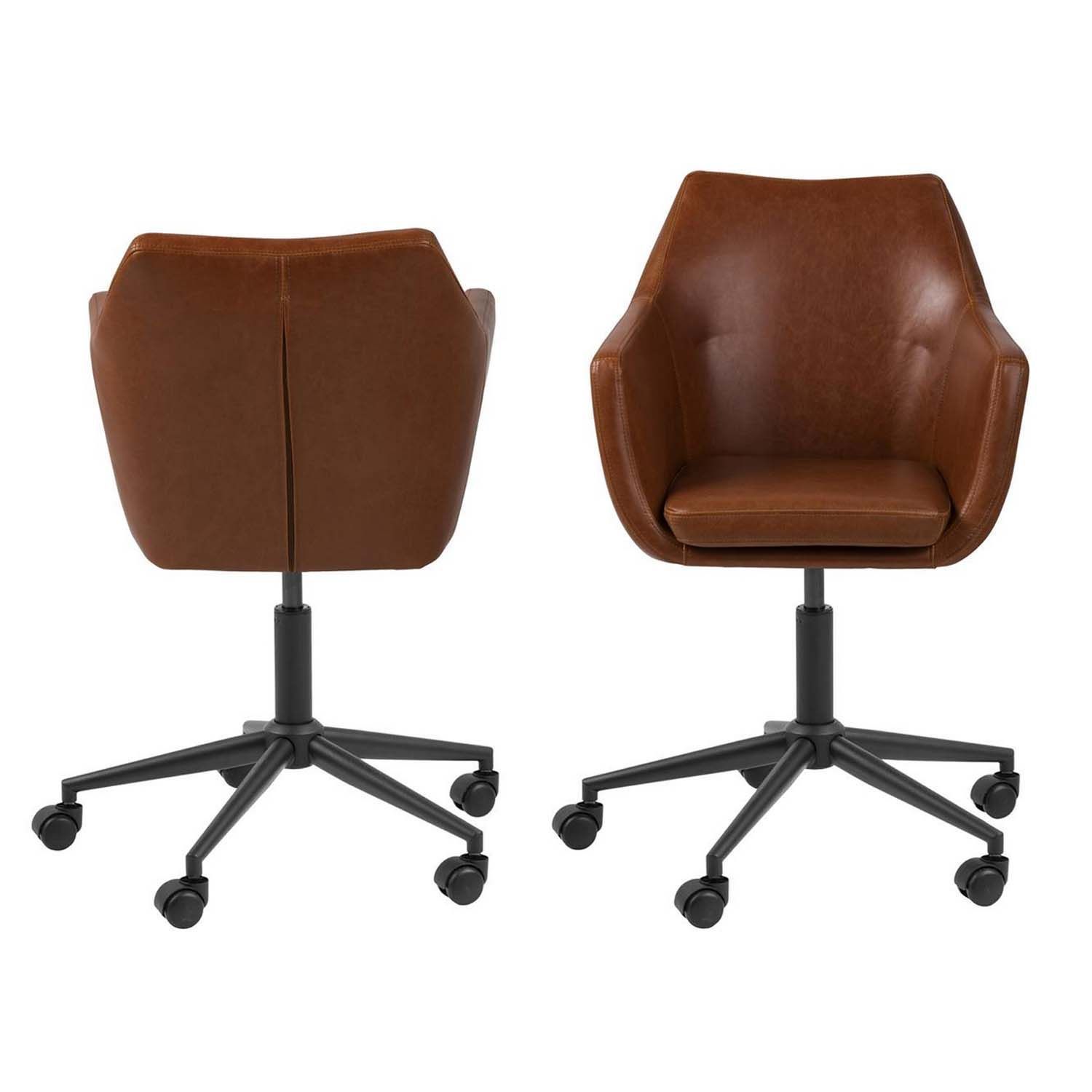 Töötool NORA brändi. Iste ja seljatugi on kaetud brändi tooni kunstnahaga. Jalarist on musta värvi metallist. Toolil on plastikrattad. Istumiskõrgus 44-54cm. Toote mõõdud on 58x58xH91cm.