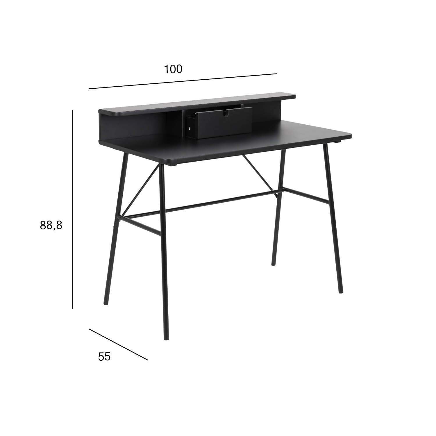 Kirjutuslaud PASCAL 100x55xH88,8cm, must. Kirjutuslaud on vajalik täiendus igas kodus, võimaldades mugavamalt arvutit kasutada või endale praktiline kodukontori ruum luua. Kirjutuslaual on sahtel ja riiul. Lauaplaat on valmistatud MDF-ist. Värvus on matt must. Jalad on valmistatud musta värvi metallist. Toote mõõdud on 100x55xH88,8cm.