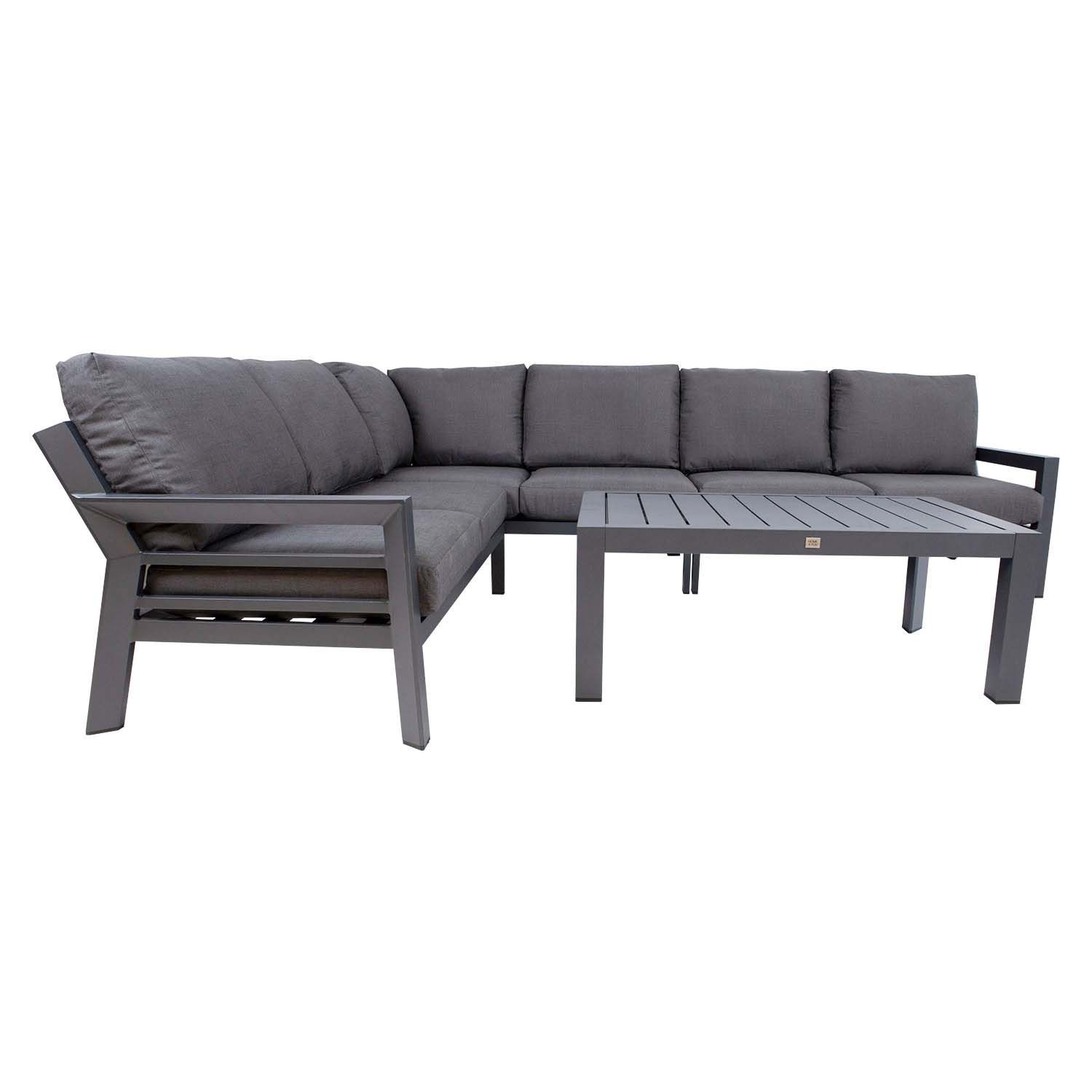 Aiamööbli komplekt TOMSON laud ja nurgadiivan, hall. Diivan ja laud on valmistatud alumiiniumist ning viimistletud tumehalli pulbervärviga. Nurgadiivan koosneb kolmest osast: vasaku käetoega 2-kohaline osa 142x85,5xH71,5cm, parema käetoega 2-kohaline osa 142x85,5xH71,5cm, 2-kohaline nurgaosa 151x85,5xH71,5cm. Laua mõõdud on 116x70xH45cm. Komplekti kuulub 6 istmepatja ja 7 seljatoepatja. Padjakatted on valmistatud hallist olefin kangas. Toode on muutlikes ilmastikutingimustes hästi vastupidav ja lihtsalt hooldatav. Kaitset ilmastikuolude eest vajavad ainult padjad. Välitingimustes kasutatava mööbli eluea pikendamiseks soovitame kasutada välimööbli katteid. HOIUSTAMINE: suvehooaja lõppedes soovitame aiamööblit hoiustada siseruumides. Puhastage ja kuivatage mööbel enne hoiule panekut. Kasutage hoiustamiseks kuiva ning hea ventilatsiooniga ruumi.