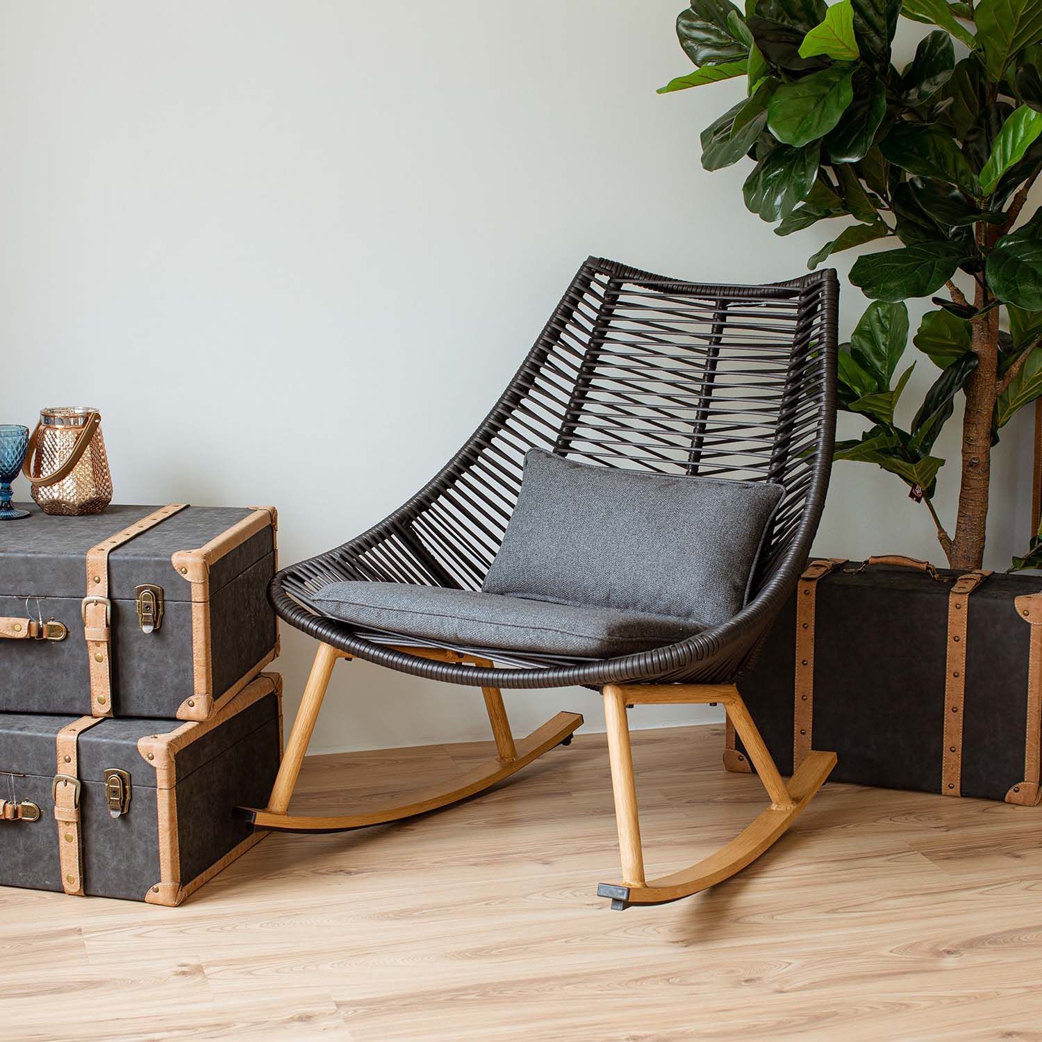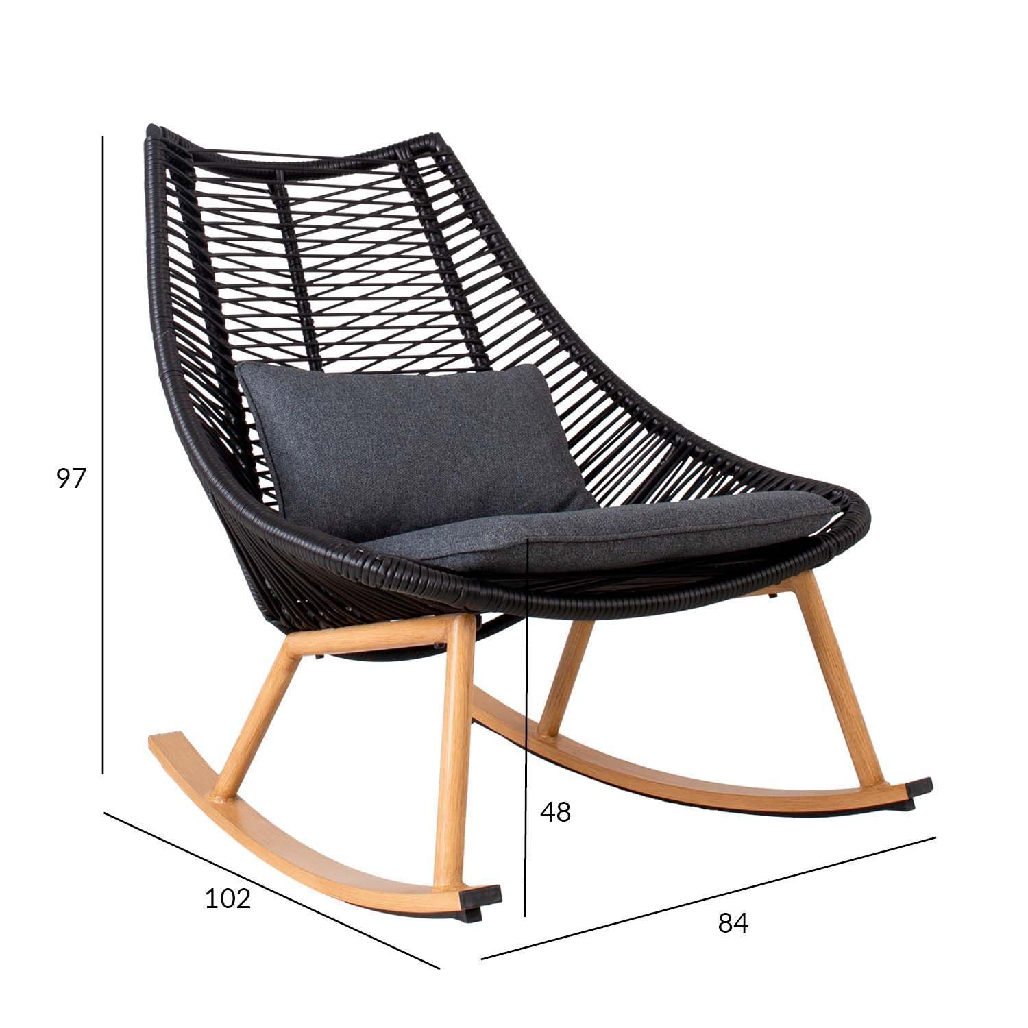 Kiiktool HELSINKI must. Kiiktool pakub mugava võimaluse aeg maha võtta ja lõõgastuda. Tooli istmeosa on kaetud musta plastikust nöörpunutisega. Komplekti kuuluvad pehmed ja mugavad padjad. Toolipadjad on kaetud tumehalli polüesterkangaga. Tooli alumiiniumist alusraam ja jalad on värvitud tiikpuidu tooni. Kiiktooli mõõdud on 84x102xH97cm.