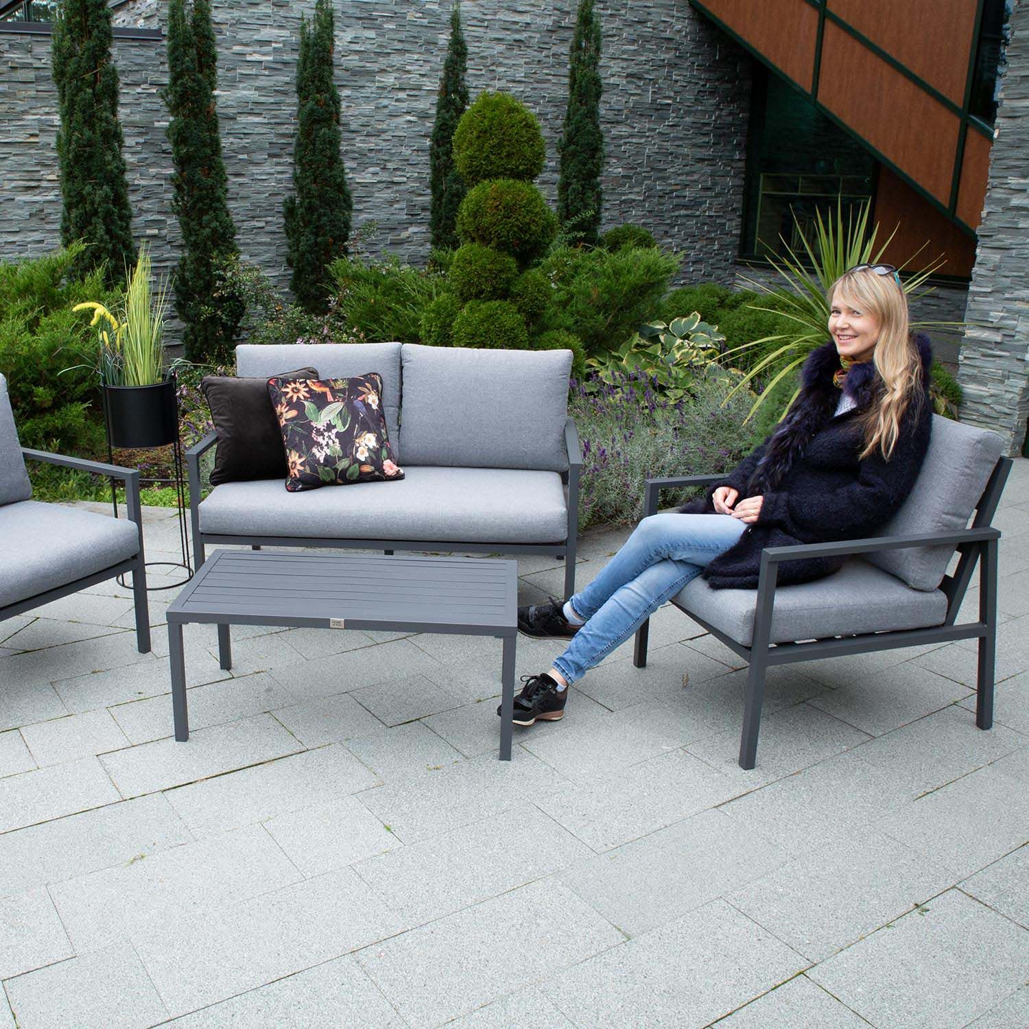 Aiamööblikomplekt ADRIO laud, diivan ja 2 tooli, hall. Kõigi komplekti osade põhikonstruktsioon ja lauaplaat on valmistatud alumiiniumist ja viimistletud halli pulbervärviga. Laua mõõdud on 90x48,5xH38,5cm. Tugitooli mõõdud on 68x79,5xH78cm, istmepadja mõõdud 62x62x8cm, seljatoepadja mõõdud 62x45x8cm. Diivani mõõdud on 128x79,5xH78cm, istmepadja mõõdud 121x62x8cm, seljatoepadja mõõdud 2tk - 62x45x8cm. Padjakatted on valmistatud hallist polüesterkangast. Toode on muutlikes ilmastikutingimustes hästi vastupidav ja lihtsalt hooldatav. Kaitset ilmastikuolude eest vajavad ainult padjad. Välitingimustes kasutatava mööbli eluea pikendamiseks soovitame kasutada välimööbli katteid. HOIUSTAMINE: suvehooaja lõppedes soovitame aiamööblit hoiustada siseruumides. Puhastage ja kuivatage mööbel enne hoiule panekut. Kasutage hoiustamiseks kuiva ning hea ventilatsiooniga ruumi.