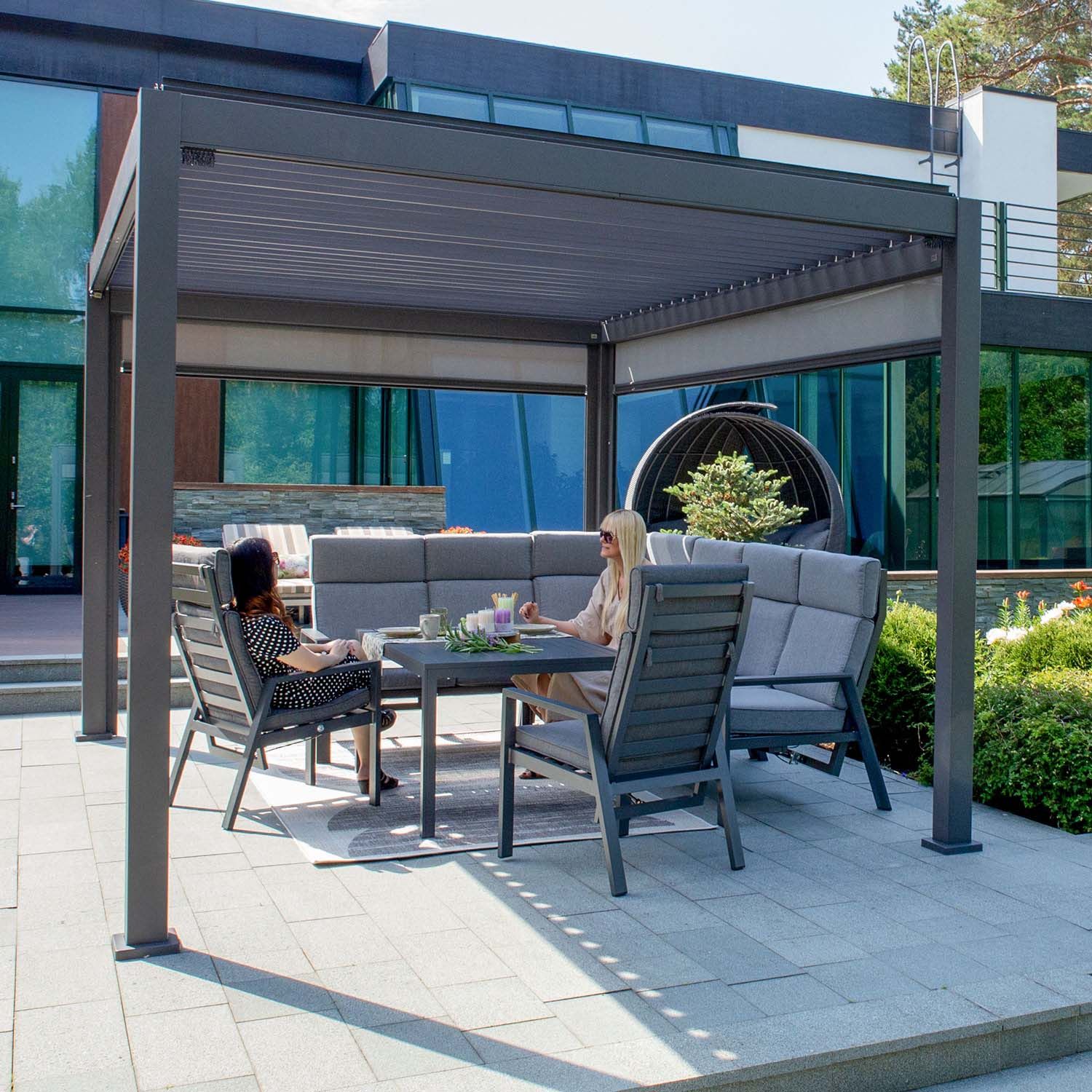 Aiamööblikomplekt CASTEN laud ja nurgadiivan. Kõigi komplekti osade põhikonstruktsioon ja lauaplaat on valmistatud alumiiniumist ja viimistletud tumehalli pulbervärviga. Textilene kangast istmed ja seljatoed lasevad hästi õhku läbi, kuivavad kiiresti ja neid on lihtne puhastada. Diivani käetoega istme seljatugi (vasakul ja paremal) on reguleeritav. Reguleerimiskang asub istme ääre all. Paksud padjad tagavad suurepärase istumismugavuse. Laua mõõdud on 140x87xH67cm. Nurgadiivan koosneb 3-st osast: parema käetoega 2-kohaline osa 127x81xH105cm, vasaku käetoega 2-kohaline osa 127x81xH105cm, nurk 141x81xH105cm. Komplekti kuulub 6 istmepatja 60x60x10cm ja 7 seljatoepatja 60x65x8cm. Padjakatted on valmistatud hallist polüesterkangast. Toode on muutlikes ilmastikutingimustes hästi vastupidav ja lihtsalt hooldatav. Kaitset ilmastikuolude eest vajavad ainult padjad. Hea lahendus patjade igapäevaseks hoiustamiseks ja kuivana hoidmiseks on padjakast. Välitingimustes kasutatava mööbli eluea pikendamiseks soovitame kasutada välimööbli katteid. HOIUSTAMINE: suvehooaja lõppedes soovitame aiamööblit hoiustada siseruumides. Puhastage ja kuivatage mööbel enne hoiule panekut. Kasutage hoiustamiseks kuiva ning hea ventilatsiooniga ruumi.