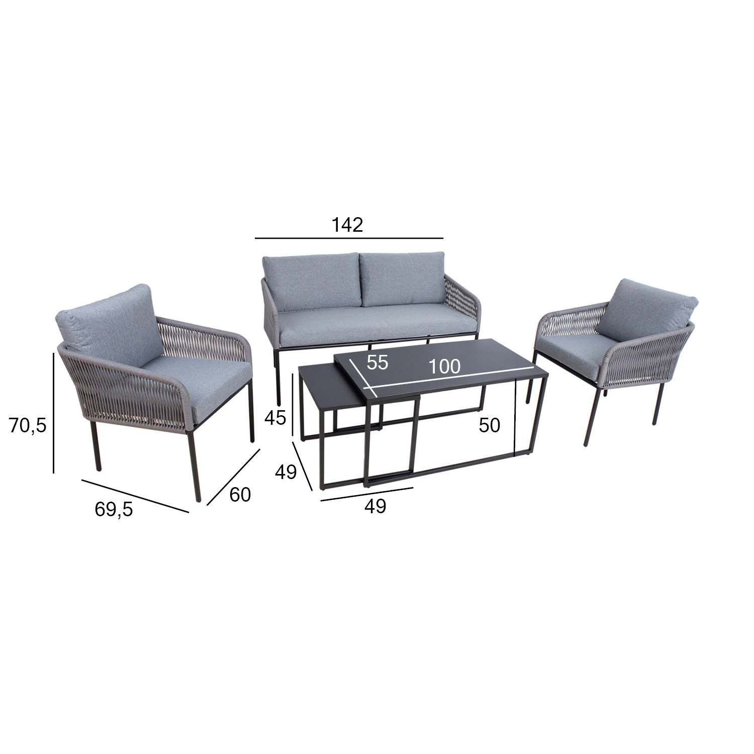 Aiamööblikomplekt LEVINE 2 lauda, diivan ja 2 tugitooli, hall. Komplekti kuulub 2 diivanilauda, mida võib paigutada vastavalt vajadusele üksteise alla või eraldi. Diivani, toolide ja laudade põhikonstruktsioon on valmistatud terasest, lauaplaadid on valmistatud 1mm lehtmetallist. Kõik metallist osad on viimistletud halli pulbervärviga. Diivani ja toolide selja- ja käetoed on kaetud nöörpunutisega. Pehmed hallid padjad tagavad istumismugavuse. Padjakatted on valmistatud hallist polüesterkangast. Komplekti kuulub 2 toolipatja 55x60x8cm, 2 seljatoepatja 54x48x8cm, diivani istmepadi 135x60x8cm ja 2 seljatoepatja 68x40x8cm. Lukuga suletavad padjakatted on eemaldatavad ja pestavad. Laudade mõõdud on 49x49xH45cm, 100x55xH50cm. Diivani mõõdud on 142x69,5xH70,5cm. Tugitooli mõõdud 60x69,5xH70,5cm. Istme kõrgus raami ääreni on 41cm, koos padjaga 49cm. Toode on muutlikes ilmastikutingimustes hästi vastupidav ja lihtsalt hooldatav. Kaitset ilmastikuolude eest vajavad ainult padjad. Välitingimustes kasutatava mööbli eluea pikendamiseks soovitame kasutada välimööbli katteid. HOIUSTAMINE: suvehooaja lõppedes soovitame aiamööblit hoiustada siseruumides. Puhastage ja kuivatage mööbel enne hoiule panekut. Kasutage hoiustamiseks kuiva ning hea ventilatsiooniga ruumi.