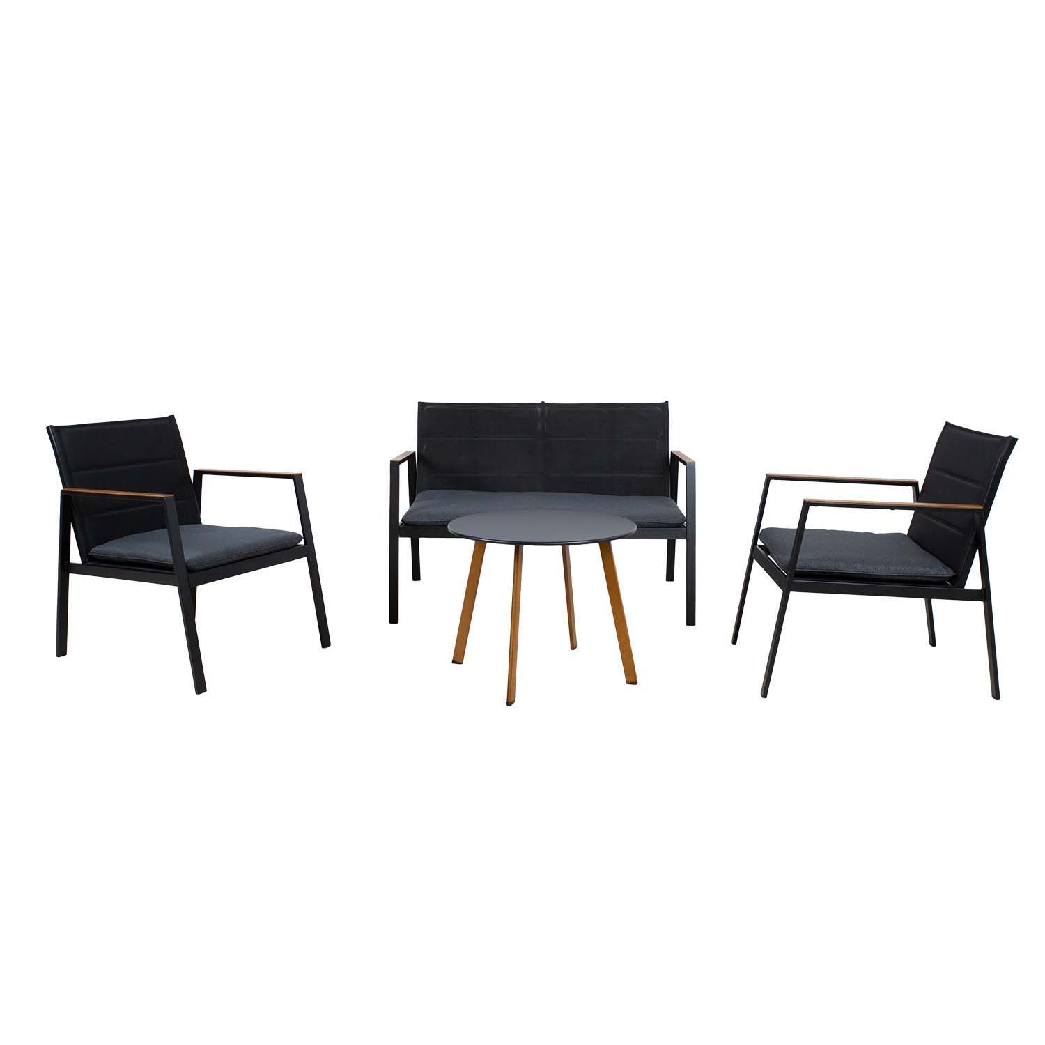 Aiamööblikomplekt ABER laud, 2-kohaline diivan ja 2 tugitooli. Lauaplaat ja komplekti kõigi osade raamid on valmistatud terasest ja viimistletud halli ja pulbervärviga. Lauajalad ja diivani ning toolide käetoed on värvitud pintsliga, et saavutada puitu meenutav välimus. Diivani ja toolide 2-kihilised textilene istmed on kergelt polsterdatud. Istmepatjade katted on valmistatud polüesterkangast. Laua mõõdud on D60xH50cm. Diivani mõõdud on 16x73xH79cm. Istmepadja paksus 5cm. Toode on muutlikes ilmastikutingimustes hästi vastupidav ja lihtsalt hooldatav. HOIUSTAMINE: suvehooaja lõppedes soovitame aiamööblit hoiustada siseruumides. Puhastage ja kuivatage mööbel enne hoiule panekut. Kasutage hoiustamiseks kuiva ning hea ventilatsiooniga ruumi.