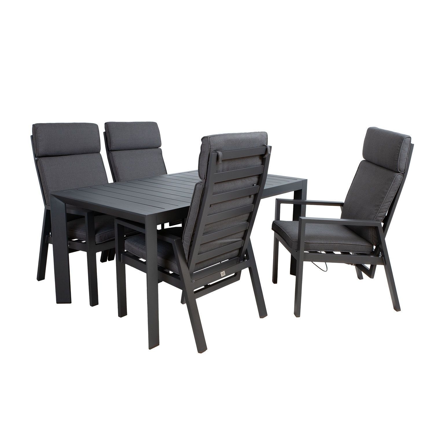 Aiamööblikomplekt TOMSON laud ja 4 tooli. Laua mõõdud on 160x90xH73cm. Lauaplaat ja jalad ning toolide jalad ja raam on valmistatud alumiiniumist ja viimistletud tumehalli pulbervärviga. Tooli seljatugi on reguleeritav gaasamordi abil. Reguleerimisnupp asub tooli istme paremal küljel. Istmepadi kuulub komplekti. Istmepadja mõõdud on 122x51xH6cm. Padjakate on valmistatud hallist olefin kangast. Padjakate on eemaldav ja pestav. Tooli istme laius on 50cm, istme sügavus 48cm, istme kõrgus 40,5/46,5cm. Käetoe kõrgus maast 61cm. Kaalupiirang 120kg. Toode on muutlikes ilmastikutingimustes väga hästi vastupidav ja lihtsalt hooldatav. Kaitset ilmastikuolude eest vajavad ainult padjad. HOIUSTAMINE: suvehooaja lõppedes soovitame aiamööblit hoiustada siseruumides. Puhastage ja kuivatage mööbel enne hoiule panekut. Kasutage hoiustamiseks kuiva ning hea ventilatsiooniga ruumi.