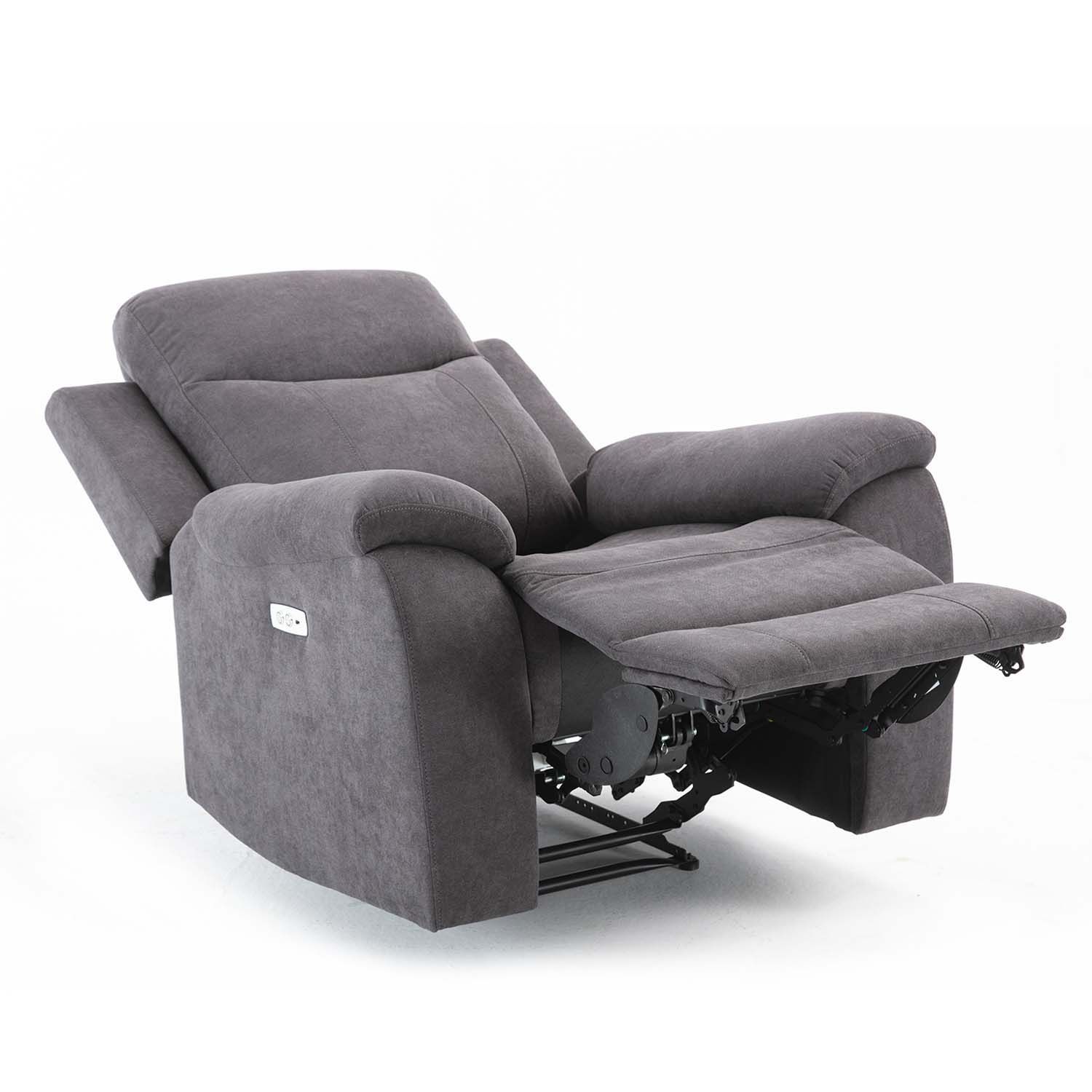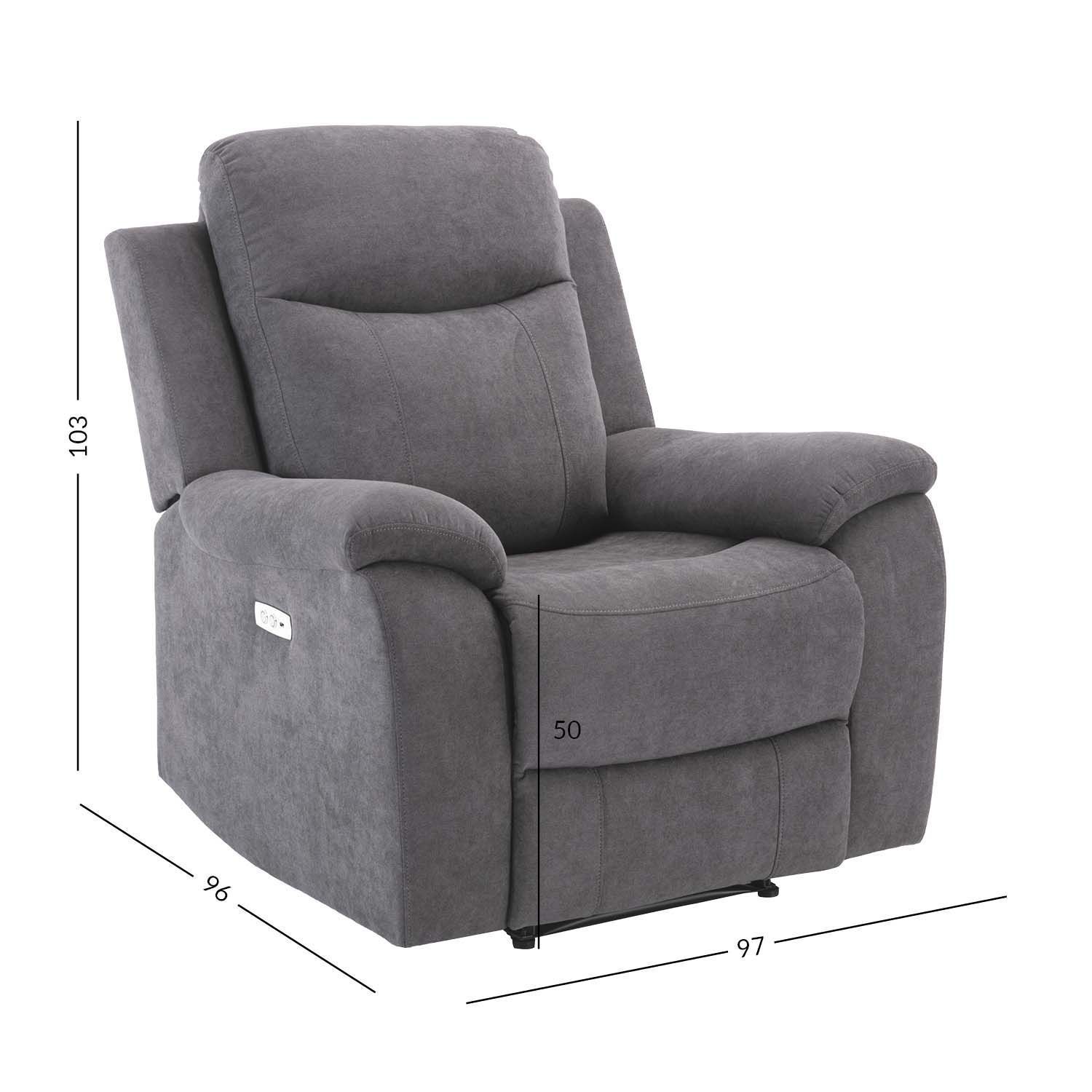 Tugitool MILO elektriline recliner 97x96xH103cm, hall. Recliner tüüpi tugitooli selja- ja jalatoe asendit on võimalik muuta elektrilise mehhanismi abil. Jalatuge üles tõstes liigub seljatugi sujuvalt kaasa lamavasse asendisse. Kattematerjal: 100% polüesterkangas, Martindale 15 000. Karkass: puit, vineer ja metall. Tugitoolil on siksak ja pocket vedrustus. Polsterdus: polüuretaanvaht.
