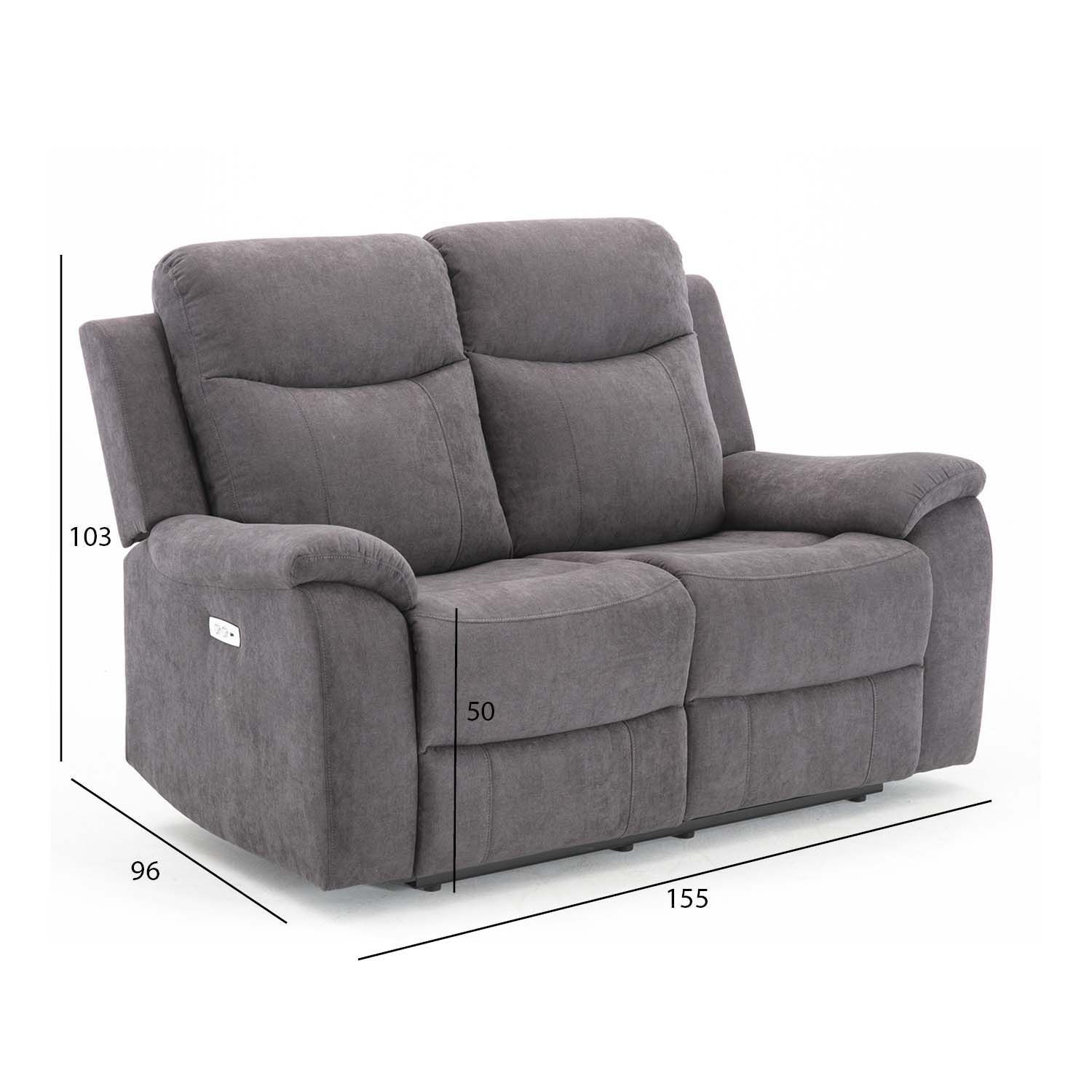 Diivan MILO 2-kohaline elektriline recliner 155x96xH103cm, hall. Recliner tüüpi diivani mõlema istme selja- ja jalatoe asendit on võimalik muuta elektrilise mehhanismi abil. Jalatuge üles tõstes liigub seljatugi sujuvalt kaasa lamavasse asendisse. Kattematerjal: 100% polüesterkangas, Martindale 15 000. Karkass: puit, vineer ja metall. Tugitoolil on siksak ja pocket vedrustus. Polsterdus: polüuretaanvaht.