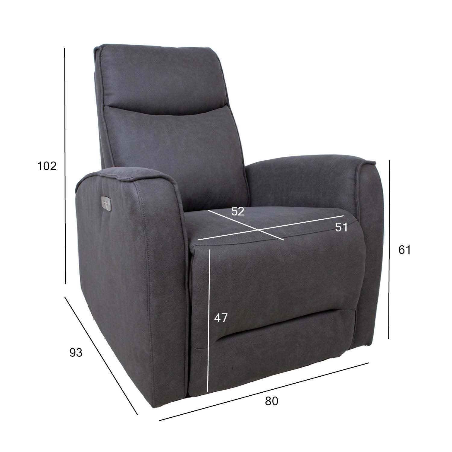 Tugitool BUSTER elektriline recliner 80x93xH102cm, hall. Recliner tüüpi tugitooli jalatoe asendit on võimalik muuta elektrilise mehhanismi abil. Jalatuge üles tõstes liigub seljatugi sujuvalt kaasa. Kattematerjal: kunstnahka meenutav pehme polüesterkangas. Karkass ja vedrustus: puit, vineer ja metall. Pocket vedrud. Polsterdus: polüuretaanvaht 20-28kg/m³. Tooli üldmõõdud on 80x93xH102cm. Istme laius 51cm, istme sügavus 52cm, istme kõrgus 47cm. Käetoe kõrgus maast 61cm. Tugitooli tagakülg on viimistletud ja see on ruumi keskele paigutatav.