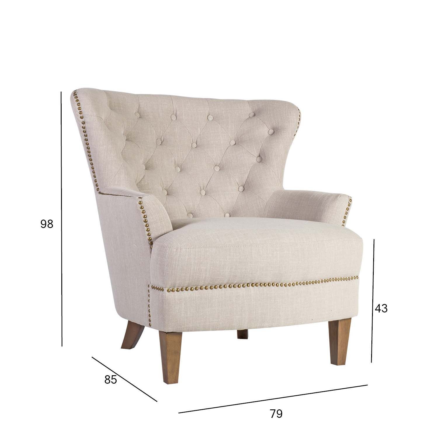 Tugitool HOLMES 79x85xH98cm, beež. Tugitool on kaetud beeži linase välimusega kangaga. Kattematerjal on 57,7% polüester, 25,7% viskoos, 16,6% linane kangas. Polsterdus: polüuretaanvaht. Tugitoolil on puidust jalad. Toote mõõdud on 79x85xH98cm.