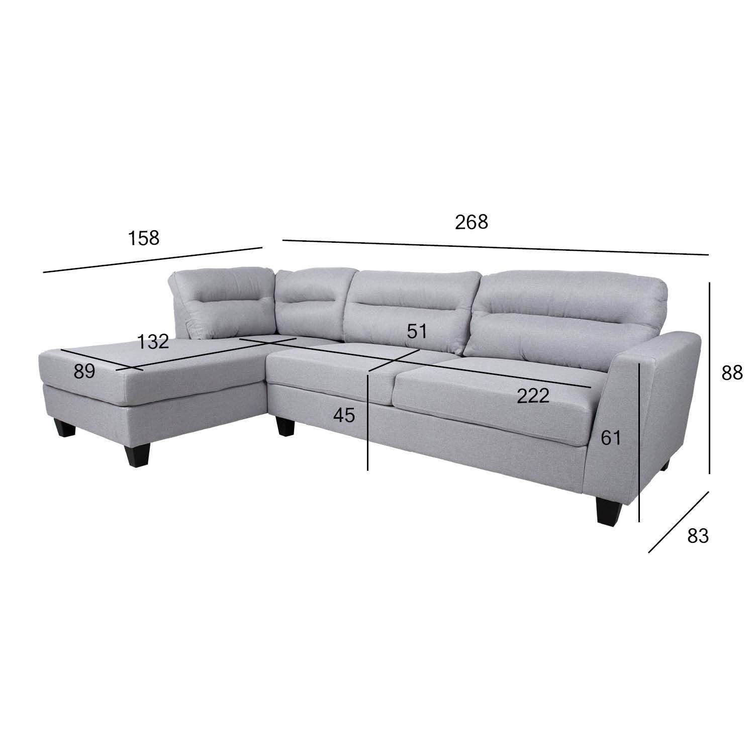 Nurgadiivan HELSINKI vasak nurk, helehall. Diivani karkass on valmistatud täispuidust ja vineerist. Polsterduseks on kasutaud polüuretaanvahtu tihedusega 25-28kg/m³. Istme sees on pocket vedruplokk. Lahtised seljatoepadjad kinnituvad seljatoe külge tõmbluku ja takjaribaga. Padjad on täidetud polüesterkiuga. Diivani kattematerjal: 100% polüesterkangagas. Diivani üldmõõdud on 268x158/83xH88cm. Istme laius 165+57cm, istme sügavus 51/132cm, istme kõrgus 45cm. Käetoe kõrgus maast 61cm, käetoe laius 15cm. Diivanil on tumedad plastikust jalad H12cm.