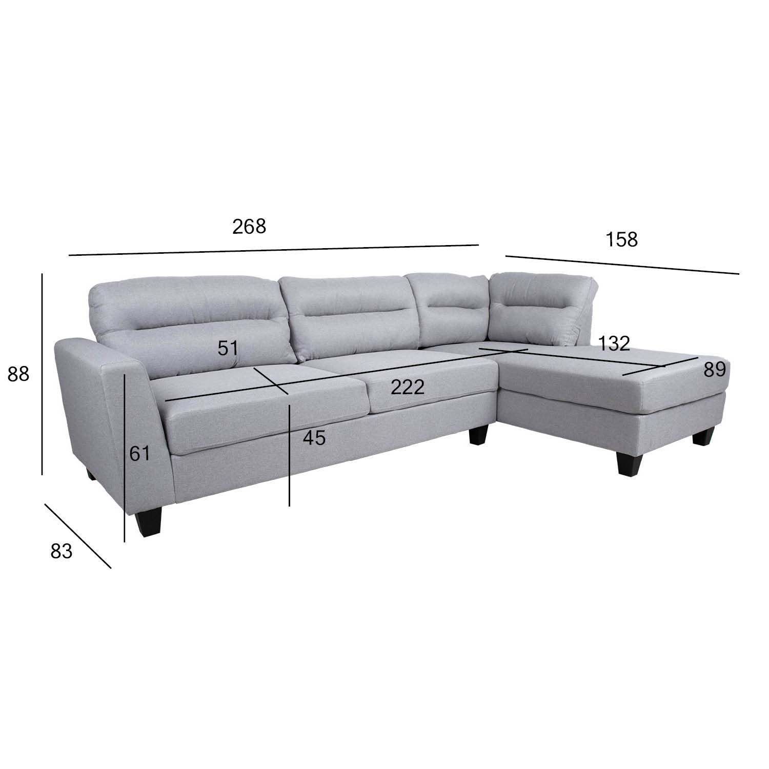 Nurgadiivan HELSINKI parem nurk, helehall. Diivani karkass on valmistatud täispuidust ja vineerist. Polsterdus eks on kasutaud polüuretaanvahtu tihedusega 25-28kg/m³. Istme sees on pocket vedruplokk. Lahtised seljatoepadjad kinnituvad seljatoe külge tõmbluku ja takjaribaga. Padjad on täidetud polüesterkiuga. Diivani kattematerjal: 100% polüesterkangagas. Diivani üldmõõdud on 268x83/158xH88cm. Istme laius 165+57cm, istme sügavus 51/132cm, istme kõrgus 45cm. Käetoe kõrgus maast 61cm. Diivanil on tumedad plastikust jalad.