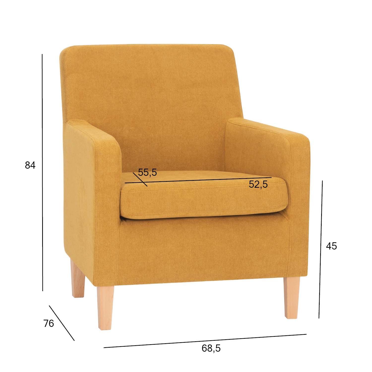 Tugitool LEENE kollane. Istmepadi on kaetud 130g/m2 polüesterkangaga, Martindale 40 000. Kate on eemaldatav. Istmepadi on valmistatud 100mm 35kg/m3 poroloonist. Tugitooli karkass on valmistatud puidust, vineerist, puitkiud- ja puitlaastplaadist. Raam on kaetud porolooniga. Toolil on siksak vedrustus. Toolil on neli kasepuidust jalga, mille kõrgus on 14cm. Käetugede laius on 8cm. Istme kõrgus on 45cm, istme laius 52,5cm, istme sügavus 55,5cm. Tooli kaalupiirang on 130kg. Toote mõõdud on 68,5x76xH84cm. Toode on valmistatud EL-is.