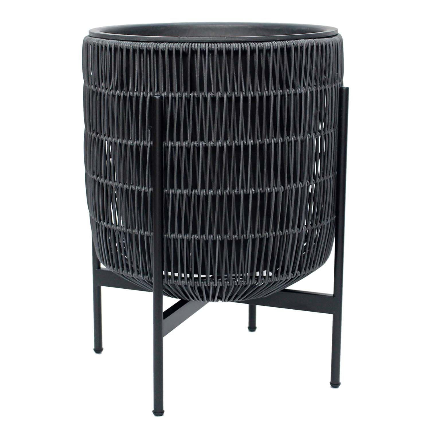 Lillepott WICKER alusega 38x38xH49cm, must. Lillepoti metallraam on kaetud plastikpunutisega. Lillepoti mõõdud on D36xH36cm. Plastikust sisepoti mõõdud on D30xH30cm. Sisepott on ilma auguta. Komplekti kuulub must metallist alusraam.