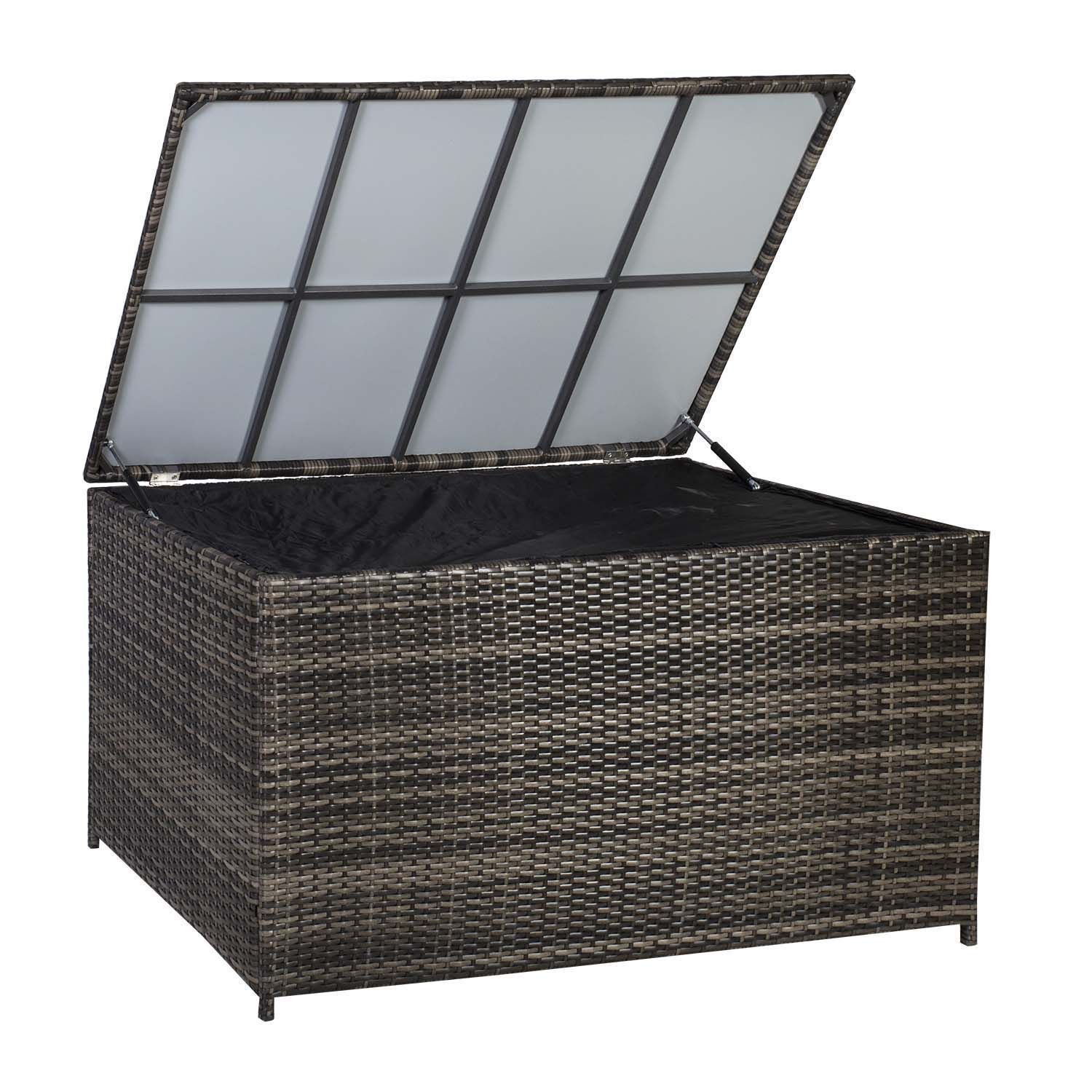 Padjakast WICKER 140x80xH65cm, tumepruun. Padjakast on hea lahendus aiamööbli patjade hoiustamiseks ja ilmastikumõjude eest kaitsmiseks. Padjakasti terasraam on kaetud plastikpunutisega. Kasti sees on must polüesterkangast vooder. Toode on muutlikes ilmastikutingimustes hästi vastupidav ja lihtsalt hooldatav. HOIUSTAMINE: suvehooaja lõppedes soovitame aiamööblit hoiustada siseruumides. Puhastage ja kuivatage mööbel enne hoiule panekut. Kasutage hoiustamiseks kuiva ning hea ventilatsiooniga ruumi.