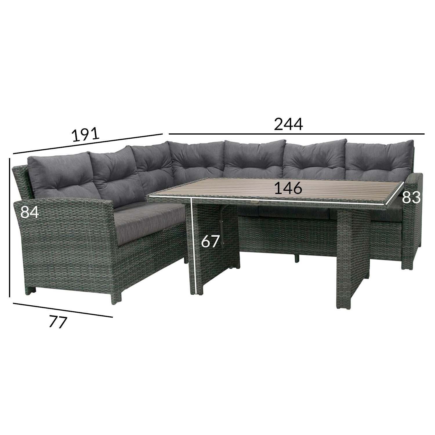 Aiamööblikomplekt PAVIA laud ja nurgadiivan, tumehall. Laua ja diivanite raamid on valmistatud alumiiniumist ja kaetud tumehalli plastikpunutisega. Laua mõõdud on 146x83xH67cm, lauaplaat: hallikaspruun harjatud kunstpuit. Diivan koosneb kahest osast: 3-kohaline diivan 191x77xH84cm, 2-kohaline diivan 166x77xH84cm. Istme kõrgus 47cm (koos padjaga), istme sügavus 48cm. Käetoe kõrgus maast 65cm. Komplekti kuulub 6 istmepatja ja 7 seljatoepatja. Patjade kattematerjal: hall polüesterkangas, täidis: plaatporoloon/kiudpolüester. Istmepatjade paksus 10cm, seljatoepatjade paksus 8cm. Toode on muutlikes ilmastikutingimustes hästi vastupidav ja lihtsalt hooldatav. Kaitset ilmastikuolude eest vajavad ainult padjad. Hea lahendus patjade igapäevaseks hoiustamiseks ja kuivana hoidmiseks on padjakast. Välitingimustes kasutatava mööbli eluea pikendamiseks soovitame kasutada välimööbli katteid. HOIUSTAMINE: suvehooaja lõppedes soovitame aiamööblit hoiustada siseruumides. Puhastage ja kuivatage mööbel enne hoiule panekut. Kasutage hoiustamiseks kuiva ning hea ventilatsiooniga ruumi.