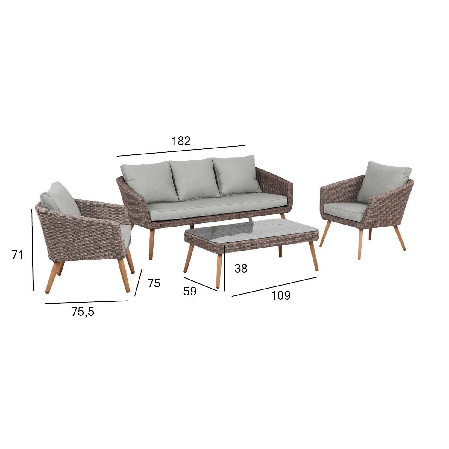 Aiamööblikomplekt NORWAY laud, diivan ja 2 tooli. Komplekti kõigi osade raamid on valmistatud alumiiniumist ja kaetud helepruuni plastikpunutisega. Alumiiniumist jalad on käsitsi värvitud tiikpuud meenutava beeži värviga. Istmepadjad kuuluvad komplekti. Padjakatted on valmistatud helehallist polüesterkangast. Laua mõõdud on 109x59xH38cm, lauaplaat: karastatud läbipaistev klaas. Diivani mõõdud on 182x79xH71cm, tooli mõõdud on 75x75,5xH71cm. Toode on muutlikes ilmastikutingimustes hästi vastupidav ja lihtsalt hooldatav. Kaitset ilmastikuolude eest vajavad ainult padjad. Välitingimustes kasutatava mööbli eluea pikendamiseks soovitame kasutada välimööbli katteid. HOIUSTAMINE: suvehooaja lõppedes soovitame aiamööblit hoiustada siseruumides. Puhastage ja kuivatage mööbel enne hoiule panekut. Kasutage hoiustamiseks kuiva ning hea ventilatsiooniga ruumi.