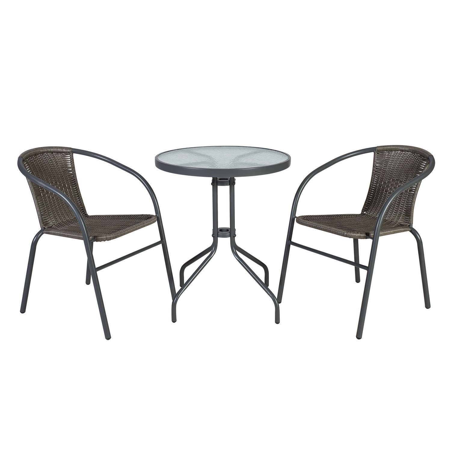 Rõdukomplekt BISTRO laud ja 2 tooli. Lauaplaat on valmistatud läbipaistvast karastatud laineklaasist. Laua ja toolide jalad ja raam on valmistatud terasest ja viimistletud halli pulbervärviga. Tooli iste ja seljatugi on kaetud pruunikashalli plastikpunutisega. Laua mõõdud on D60xH70cm. Tooli üldmõõdud on 52x58xH73cm. Kaalupiirang 100kg. Toolid on virnastatavad ning nende hoiustamine on lihtne ja ruumi säästev. Toode on muutlikes ilmastikutingimustes vastupidav ja lihtsalt hooldatav. HOIUSTAMINE: suvehooaja lõppedes soovitame aiamööblit hoiustada siseruumides. Puhastage ja kuivatage mööbel enne hoiule panekut. Kasutage hoiustamiseks kuiva ning hea ventilatsiooniga ruumi.