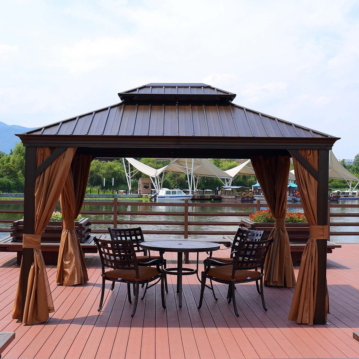 Varikatus SUNSET 3,65x4,85xH2/2,7m, pruun/beež. Elegantne ja funktsionaalne varikatus/aiapaviljon pakub kaitset ja varju nii kerge vihma, kui kõrvetava päikese eest ning võimaldab nautida õues olemist ilmast ja kellaajast olenemata. Varikatuse kõigil külgedel on beežid polüesterkangast (180g/m²) kardinad ja lukuga suletavad nailonist sääsevõrgud. Varikatuse põhikonstruktsioon on valmistatud alumiiniumist. Kõik raami osad on viimistletud pruuni pulbervärviga. Küljepostide mõõdud on 120x120mm, risttala mõõdud 130x100mm, katuseribid 61x46mm. Galvaniseeritud metallkatuse paksus on 4mm. HOIATUS: ekstreemsete ilmastikutingimuste või tormihoiatuse korral ei tohi jätta varikatust järelevalveta. Tugev tuul, vihm või lumi võivad varikatus kahjustada. HOIUSTAMINE: varikatuse eluea pikendamiseks soovitame see suvehooaja lõppedes lahti monteerida ja hoiustada kuivas ning hea ventilatsiooniga ruumis. Juhul kui varikatus jääb talveks üles tuleb jälgida, et katusele ei koguneks liigselt lund. Eemaldage kogunenud lumi esimesel võimalusel. Suvehooaja lõppedes eemaldage sääsevõrgud ja kardinad. Puhastage ja kuivatage kardinad enne hoiule panekut.