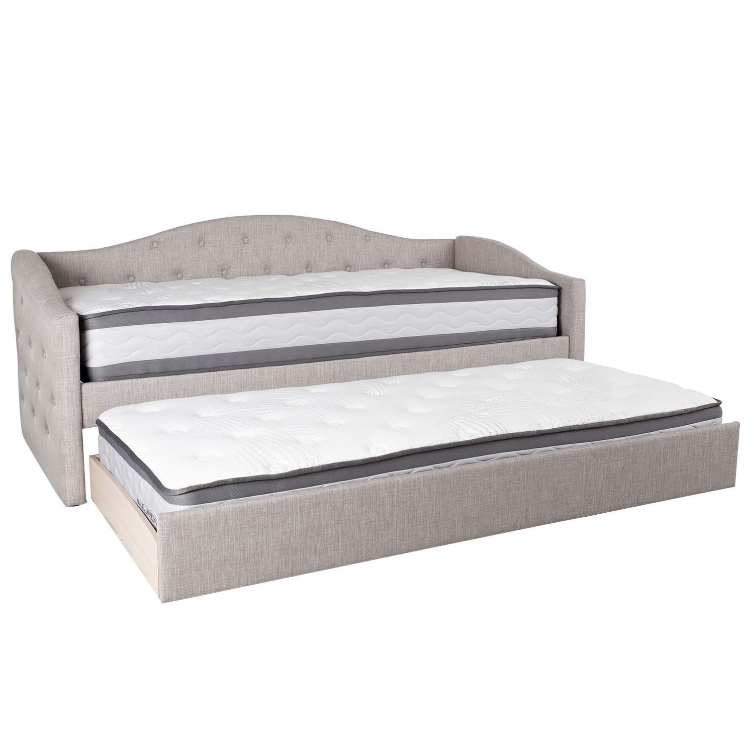 Voodi ATLANTA 90x200cm, ilma madratsiteta, hall. Voodi all on väljatõmmatav osa, mida saab kasutada lisamagamiskohana. Voodi kergelt polsterdatud korpus on valmistatud MDF plaadist ja kaetud halli polüesterkangaga. Madratsid ei kuulu komplekti. Sobivate madratsite mõõdud on 90x200cm. Lisamagamiskoha madratsi kõrgus võib olla kuni 20cm. Põhjalipid kuuluvad komplekti. Voodi üldmõõdud on 98x221xH94cm.