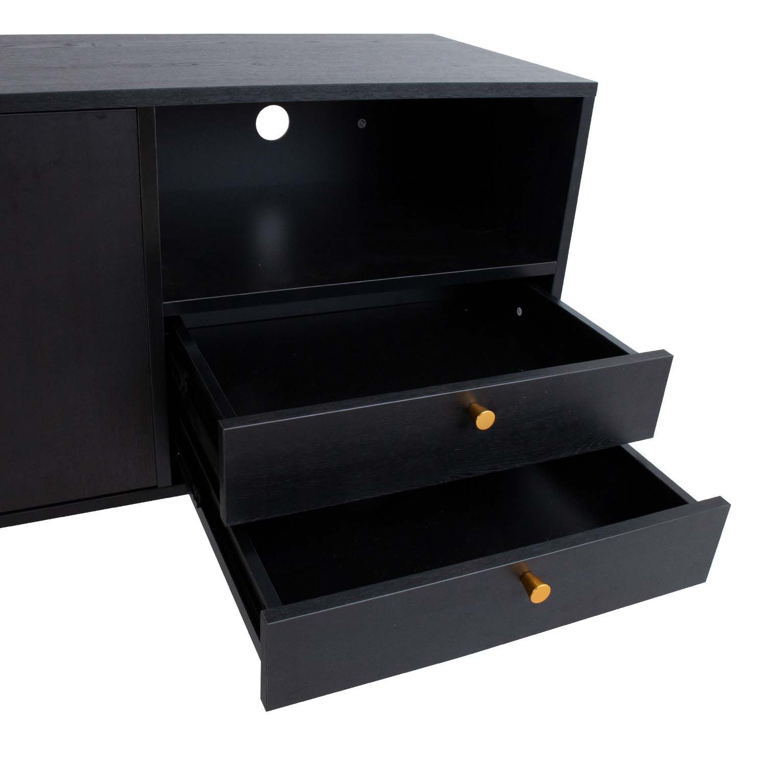 Kummut LUXEMBOURG 150x40xH80cm, must melamiin. Kummut on valmistatud puidudekooriga melamiinkattega mööbliplaadist. Jalgu seovad vasevärvi metallist detailid, mis annavad kummutile stiilse välimuse ja samas tagavad aluskonstruktsiooni tugevuse. Kummutil on kahe uksega kapp, kaks sahtlit ja üks avatud riiulivahe. Uksehinged ja sahtlisiinid on vaikselt sulguvad. Sahtlite ja uste nupud on vasevärvi alumiiniumist. Jalgade kõrgus on 35cm.