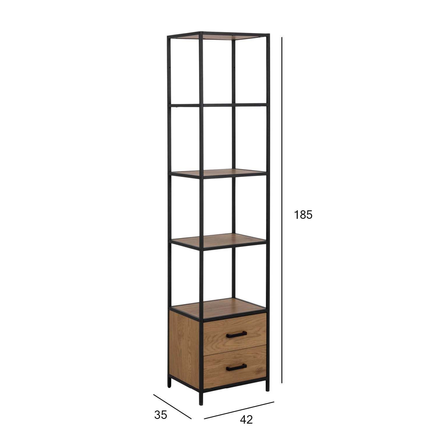 Kaasaegne tööstuslikus stiilis raamaturiiul. 2 sahtlit ja 3 riiulit. Must pulbervärvitud metallraam kontrasti loomiseks. Metsiku tamme välimus loob sooja ja hubase atmosfääri. Lihtne hooldada.