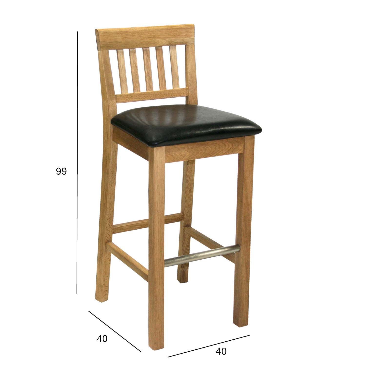 Baaritool LAURA 40x40xH99cm. Tooli iste on kergelt polsterdatud ja kaetud tumepruuni kunstnahaga. Tooli jalad ja raam on valmistatud täistammepuidust ja viimistletud puiduõliga. Kaalupiirang 136kg.