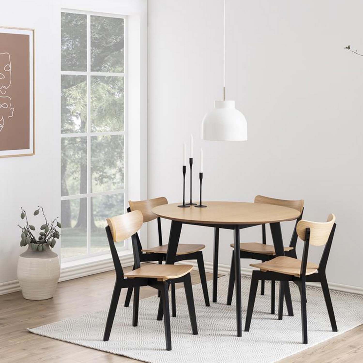 Söögilaud ROXBY D105xH76cm, tamm/must. Lauaplaat on kaetud naturaalse tammespooniga. Laud on viimistletud lakiga. Jalad on valmistatud kummipuust ning värvitud mustaks. Laua mõõdud on D105xH76cm.
