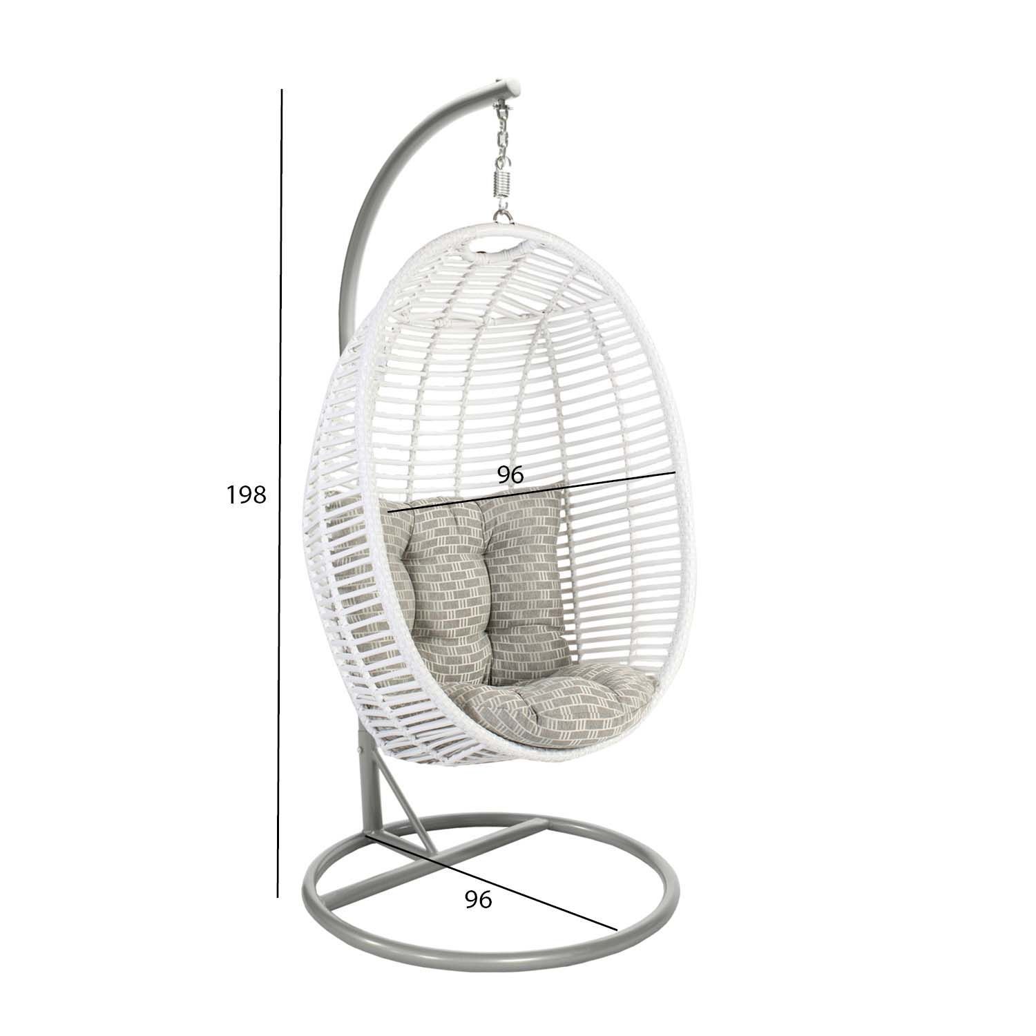 Ripptool CORA 96x96xH198cm, valge. Muutke oma suvine elutuba lõõgastavaks oaasiks trendika ripptooliga! Mõnusalt kiikuv pehme padjaga korviste pakub meeldivalt varju ja on samas piisavalt avatud päikeselise suveilma nautimiseks. Ripptool sobib hästi ka siseruumides kasutamiseks. Ripptooli tugev terasest jalg on viimistletud halli pulbervärviga. Korvistme pulbervärvitud terasraam on kaetud valge plastikpunutisega. Toote juurde kuulub 2 patja. Padjakatted on valmistatud hallist polüesterkangast. Patjade mõõdud on D70xH10cm ja 72x58x8cm. Korvistme mõõdud on 90x65xH123cm. Kaalupiirang 120kg. Toode on muutlikes ilmastikutingimustes vastupidav ja väga lihtsalt hooldatav. Kaitset ilmastikuolude eest vajavad ainult padjad. Välitingimustes kasutatava mööbli eluea pikendamiseks soovitame kasutada välimööbli katteid. HOIUSTAMINE: suvehooaja lõppedes soovitame aiamööblit hoiustada siseruumides. Puhastage ja kuivatage mööbel enne hoiule panekut. Kasutage hoiustamiseks kuiva ning hea ventilatsiooniga ruumi.