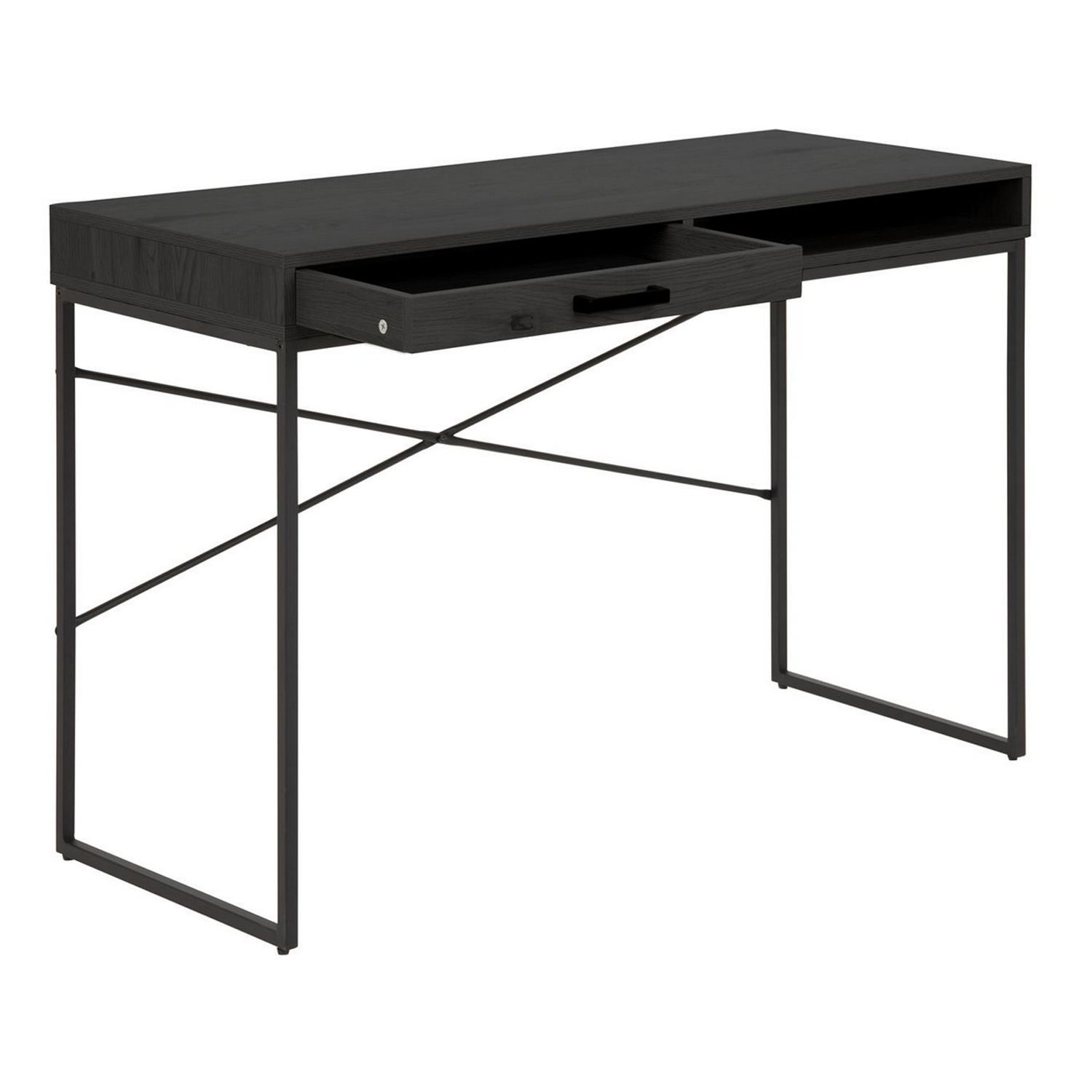 Kirjutuslaud SEAFORD 110x45xH75cm, must. Kirjutuslaud on vajalik täiendus igas kodus, võimaldades mugavamalt arvutit kasutada või endale praktiline kodukontori ruum luua. Kirjutuslaual on sahtel. Lauaplaat on valmistatud MDF-ist ja melamiinist. Värvus on must saar. Raam on valmistatud musta värvi metallist. Toote mõõdud on 110x45xH75cm. Kirjutuslaud kannatab rakskust 100kg.