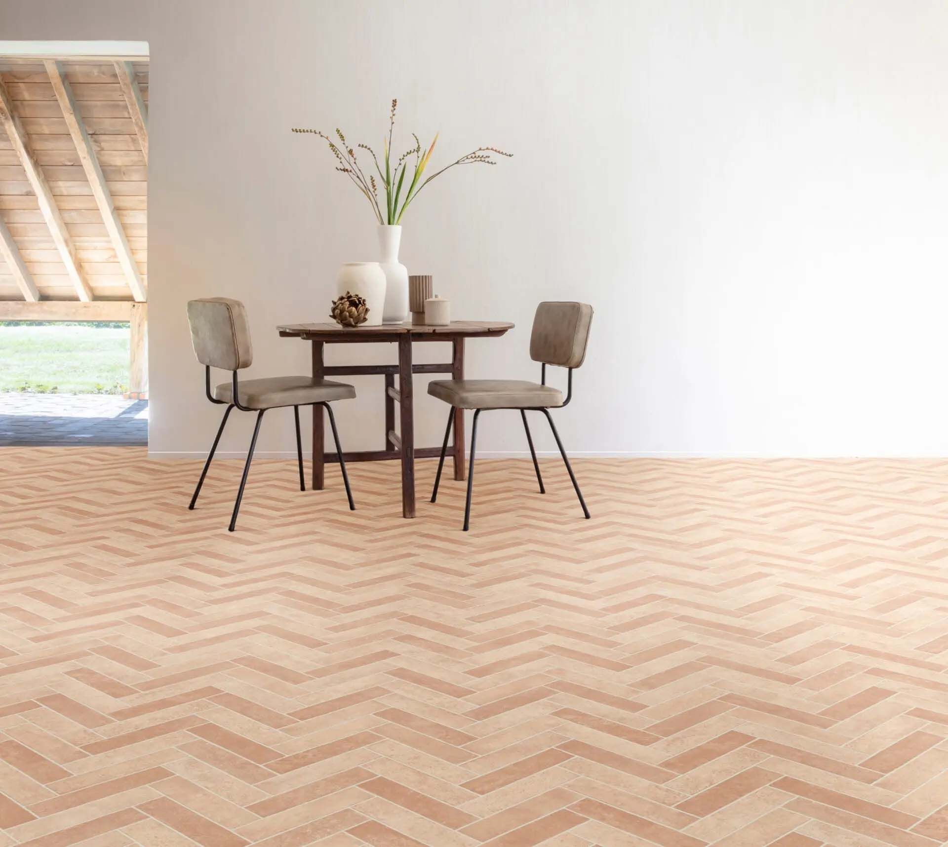 PVC kate Primo 280 Portland herringbone beige 315 2.8/0.2mm L=2m KL22. Kasutusklass: 22 - mõõdukas kodukasutus