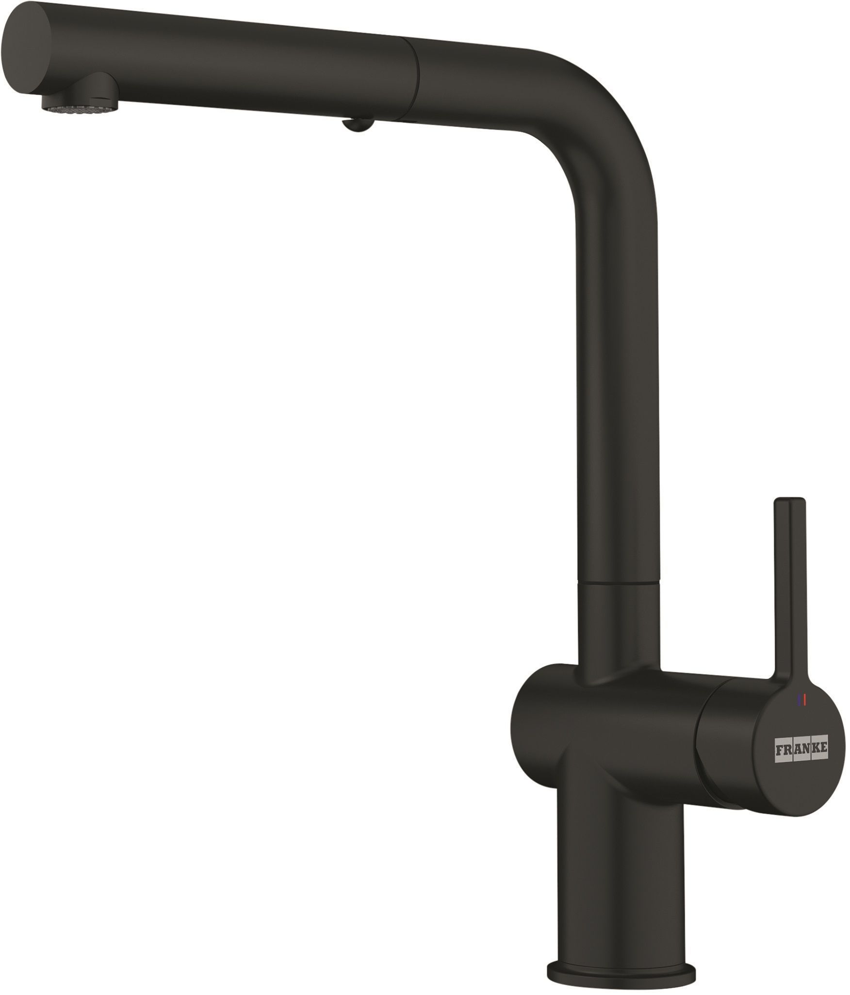 Franke Active köögisegisti, millel on väljatõmmatav otsik ja 180° pööratav L-tila. Segistil on küljehoovaga juhtimine. Komplekt sisaldab 450 mm pikkuseid veevarustusvoolikuid 3/8" ühendusega. Matt must, messingist.