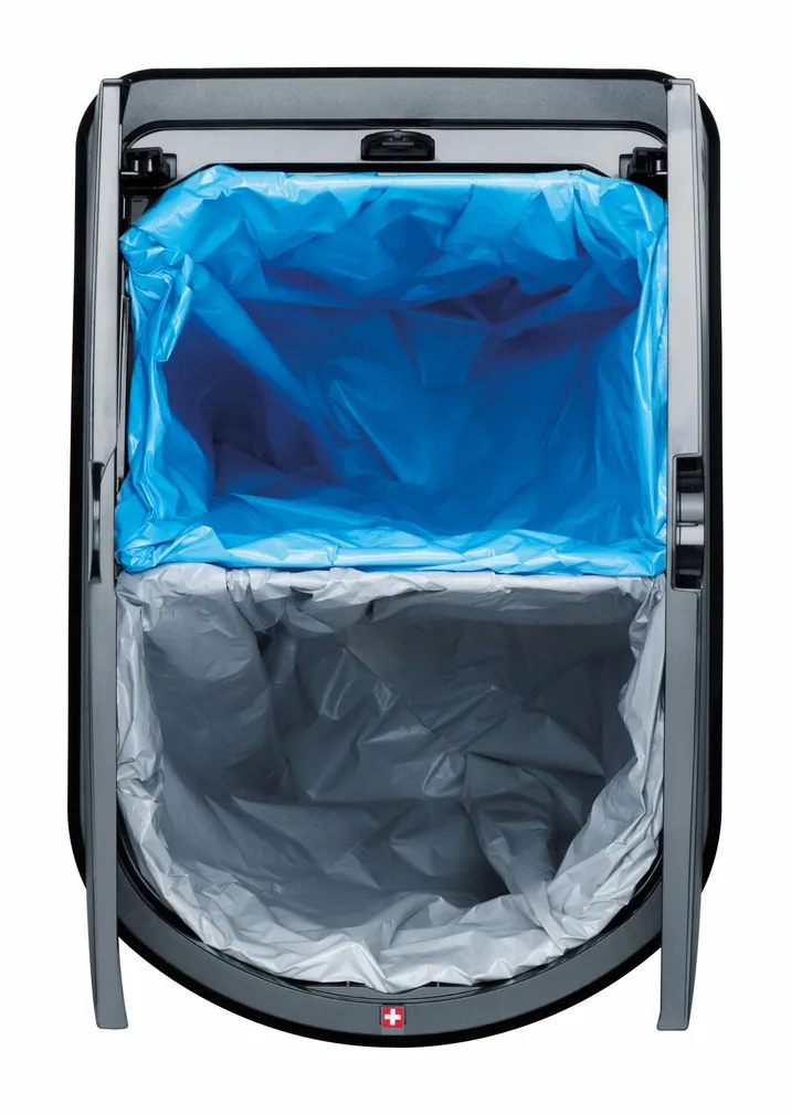 Öko-sõbralik 100% taaskasutatav prügikast, millel on mugav pedaal, ruumi säästev ovaalne kuju ja 4 metallist kinnitusdetaili kahe 25L prügikoti kinnitamiseks.
