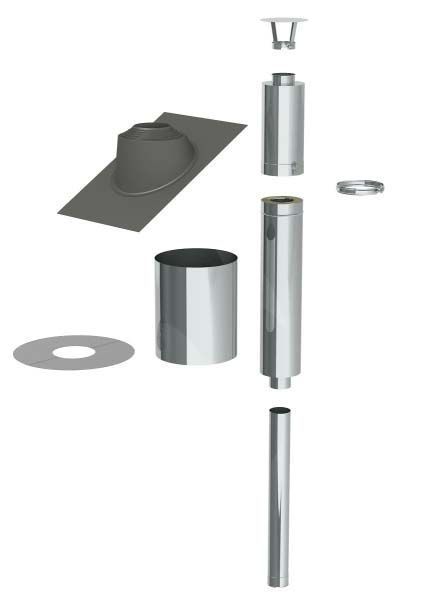Tarnekomplekt: Isoleerimata ühendustoru 1 m, mida on võimalik lühendada (minimaalne lubatud pikkus 0,2 m), isoleeritud osa (1,5 m) tarnitakse alati kahes osas (1 m ja 0,5 m), mis on ühendatud torude vahel. siderõngas. tk.), paigaldusjuhend, täiendav väljavool allavoolu, on ka eraldi testitud ja väga ohutu põrandatevaheline ülekate Lisasoojustus Pluss, kui kasutatakse paksu põrandavahelist isolatsioonikihti. Tuleb ühes karbis ja isoleeritud korstnat saab eraldi müüdavate korstnaosadega pikendada kuni 5 m.