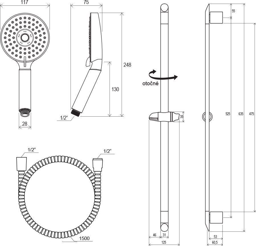 Mõõtmed: vastupidavast plastikust voolik 150 cm, kolme funktsiooniga dušiotsik diameetriga 118 mm, liigutatav dušihoidik 63,5 cm. Sobib: vannile, dušile, süvistatavale segistile, termostaatilistele segistitele. Välispinna puhastamiseks soovitame kasutada RAVAK Cleaner Chrome puhastusvahendit.