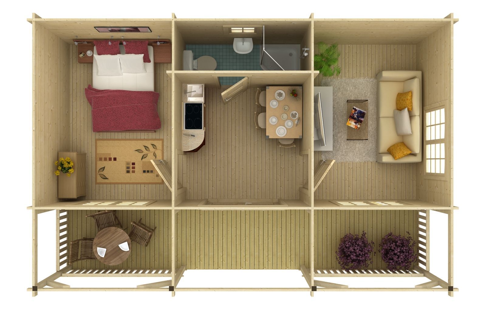 Palmako Sandra 25,6+11,1 m² on kvaliteetsest 44 mm freesprussist valmistatud aiamaja, mis sobib suurepäraselt suvekoduks, külalistemajaks või hobiruumiks. Maja avar planeering ja suurte akende kaudu sisenev loomulik valgus loovad hubase ja valgusküllase interjööri.