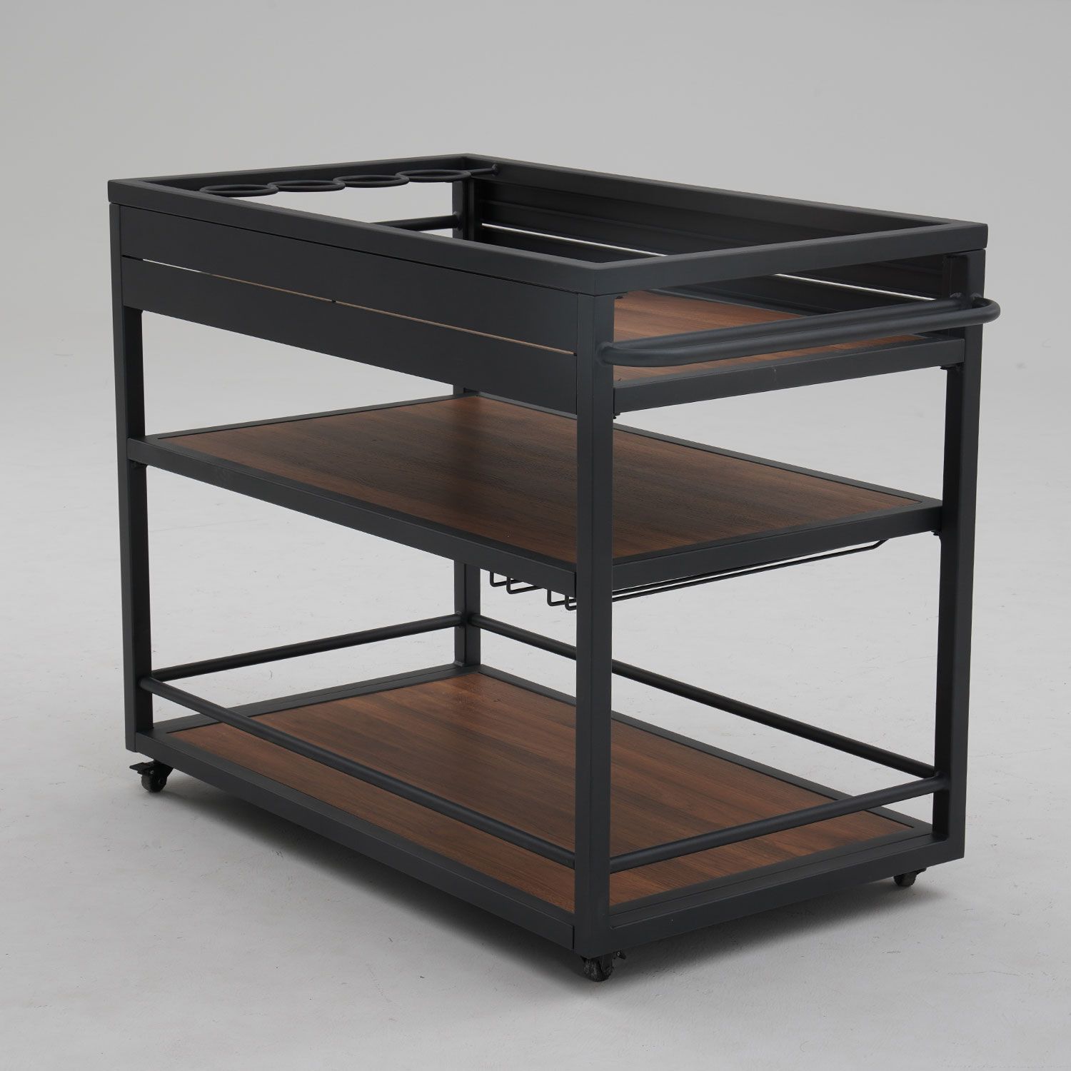 Väliköögi moodul BODEN 103/110x60xH85cm. Rataste ja sangaga mobiilne väliköögimoodul on praktiline ja funktsionaalne. Rattad saab vajadusel lukustada. Kõrged riiuliääred hoiavad nõud ja muu vajaliku turvaliselt paigas. Ülemisel riiulil on integreeritud pudelihoidja 4-le pudelile. Keskmise riiuli all on pokaalide hoidik. Köögimooduli raam on valmistatud alumiiniumist ja viimistletud tumehalli pulbervärviga. Riiulid: polükarbonaatplaat. Plaadi pealispinna tekstuur jäljendab naturaalset puitu. Köögimooduli üldmõõdud on 103/110x60xH85cm. Alumise riiulivahe 38,5cm, ülemise riiuli vahe 18cm. Ülemise riiuli sügavus 14cm. Toode on muutlikes ilmastikutingimustes hästi vastupidav ja lihtsalt hooldatav. HOIUSTAMINE: suvehooaja lõppedes soovitame aiamööblit hoiustada siseruumides. Puhastage ja kuivatage mööbel enne hoiule panekut. Kasutage hoiustamiseks kuiva ning hea ventilatsiooniga ruumi.