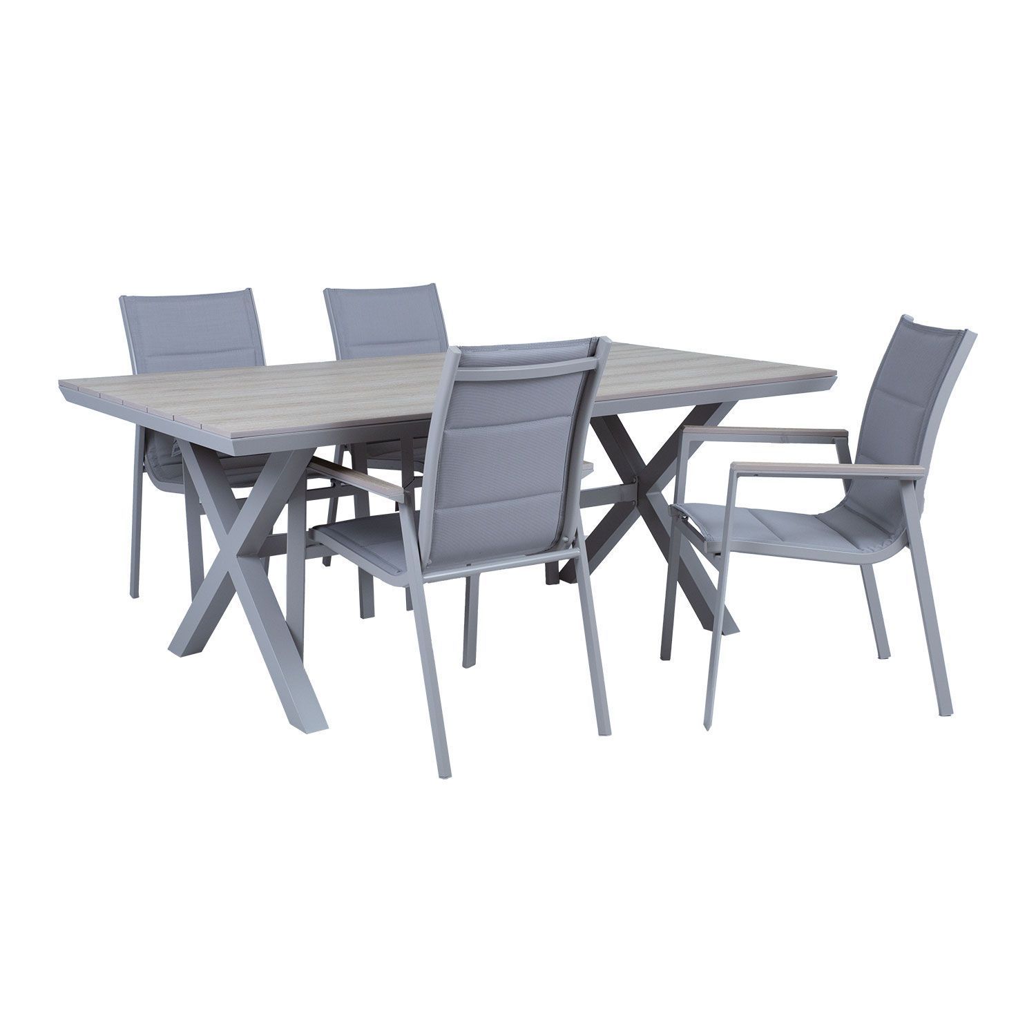 Aiamööblikomplekt CORINNA laud ja 4 tooli. Laua mõõdud on 180x100x74cm. Lauaplaat: helehall kunstpuit. Laua ristjalad ja alusraam on valmistatud alumiiniumist ja viimistletud helehalli pulbervärviga. Tooli kergelt polsterdatud textilene iste laseb hästi õhku läbi, kuivab kiiresti ja seda on lihtne puhastada. Tooli raam ja jalad on valmistatud alumiiniumist ja viimistletud pulbervärviga. Tooli käetugedel on kunstpuidust liistud. Toolid on virnastatavad ning nende hoiustamine on lihtne ja ruumi säästev. Tooli üldmõõdud on 56x64xH92cm. Istme laius 42cm, istme sügavus 43cm, istme kõrgus 44cm. Käetoe kõrgus maast 62cm. Kaalupiirang 100kg. HOIUSTAMINE: suvehooaja lõppedes soovitame aiamööblit hoiustada siseruumides. Puhastage ja kuivatage mööbel enne hoiule panekut. Kasutage hoiustamiseks kuiva ning hea ventilatsiooniga ruumi.