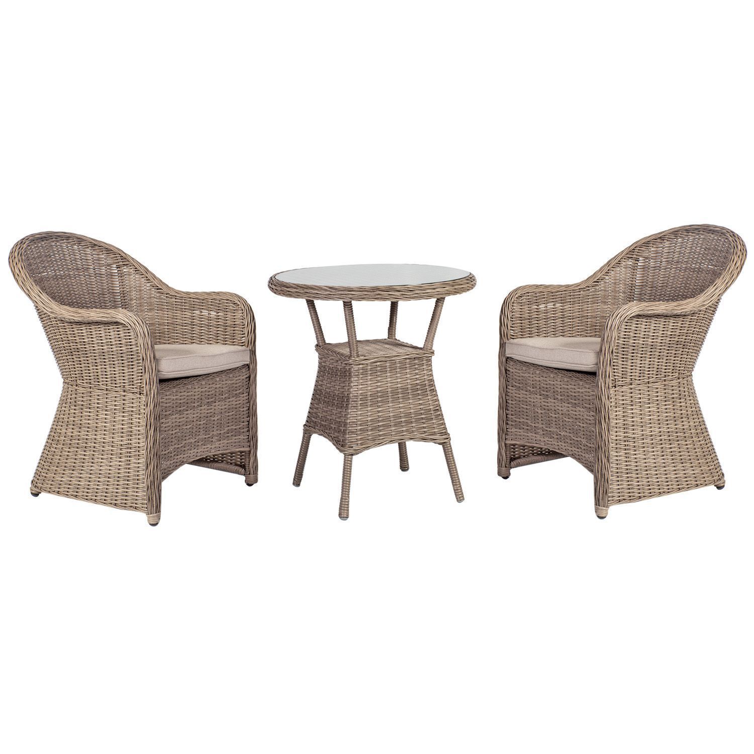 Aiamööblikomplekt TOSCANA laud ja 2 tooli. Laua mõõdud on D65xH73cm. Lauaplaat: 5mm läbipaistev karastatud klaas. Laua ja toolide pulbervärvitud alumiiniumraamid on kaetud beeži plastikpunutisega. Istmepadjad kuuluvad komplekti. Padjakate on valmistatud beežist polüesterkangast. Tooli üldmõõdud on 60x69xH86cm. Istmepadja mõõdud on 46x51xH7cm. Istme kõrgus raami ääreni 42cm. Käetoe kõrgus maast 66cm. Kaalupiirang on 100kg. Toode on muutlikes ilmastikutingimustes hästi vastupidav ja ei nõua erilist hooldust. Kaitset ilmastikuolude eest vajavad ainult padjad. Välitingimustes kasutatava mööbli eluea pikendamiseks soovitame kasutada välimööbli katteid. HOIUSTAMINE: suvehooaja lõppedes soovitame aiamööblit hoiustada siseruumides. Puhastage ja kuivatage mööbel enne hoiule panekut. Kasutage hoiustamiseks kuiva ning hea ventilatsiooniga ruumi.