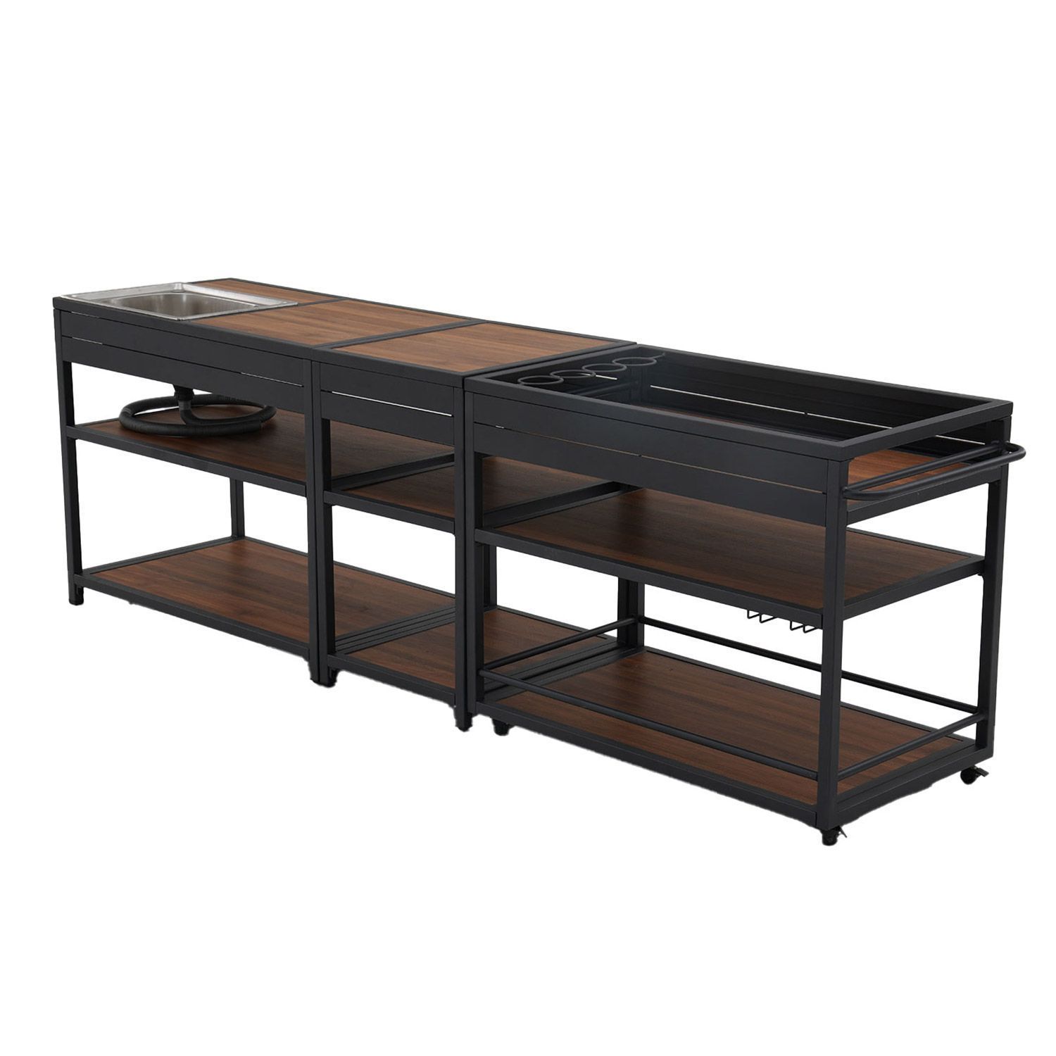 Mitmekülgne ja funktsionaalne väliköök sobib ideaalselt koduaeda, terrassile või toitlustusettevõtete välialal kasutamiseks. Piiretega riiulid, pudelite ja pokaalide hoidikud pakuvad piisavalt ruumi toiduainete, nõude ja köögitarvete turvaliseks paigutamiseks. Tänu kraanikausile on kööginurga kasutamine ja puhtana hoidmine lihtne ja mugav.