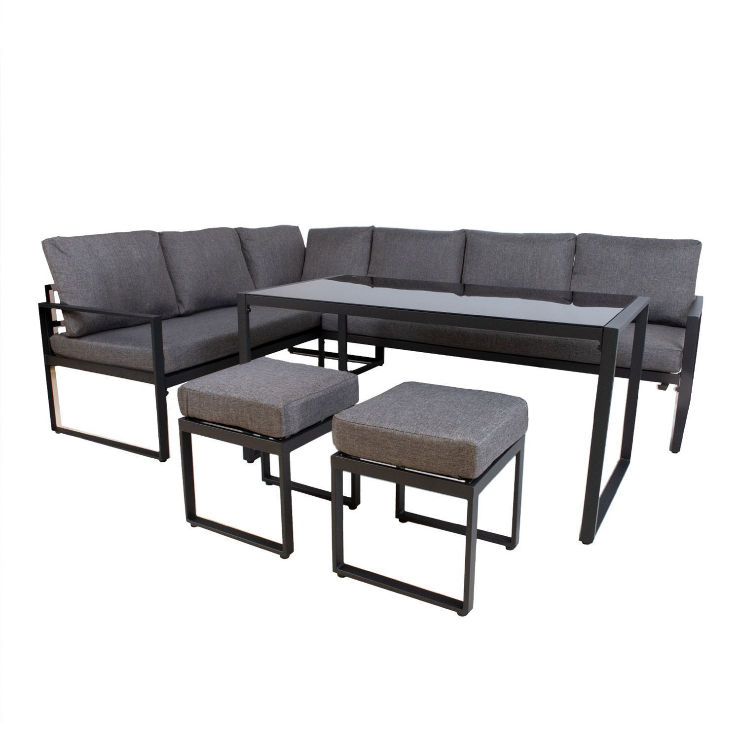 Aiamööblikomplekt LEIPZIG nurgadiivan, laud ja 2 tumbat. Komplekti kõigi osade põhikonstruktsioon on valmistatud terasest ja viimistletud tumehalli pulbervärviga. Nurgadiivan koosneb kahest 3-kohalisest moodulist mõõtudega 179x69xH66cm. Padjad kuuluvad komplekti. Padjakatted on valmistatud hallist polüesterkangast. Laua mõõdud on 135x70xH67cm, lauaplaat: 5mm tumehall karastatud klaas. Tumbade mõõdud on 40x40xH36cm. Toode on muutlikes ilmastikutingimustes hästi vastupidav ja lihtsalt hooldatav. Kaitset ilmastikuolude eest vajavad ainult padjad. Välitingimustes kasutatava mööbli eluea pikendamiseks soovitame kasutada välimööbli katteid. HOIUSTAMINE: suvehooaja lõppedes soovitame aiamööblit hoiustada siseruumides. Puhastage ja kuivatage mööbel enne hoiule panekut. Kasutage hoiustamiseks kuiva ning hea ventilatsiooniga ruumi.