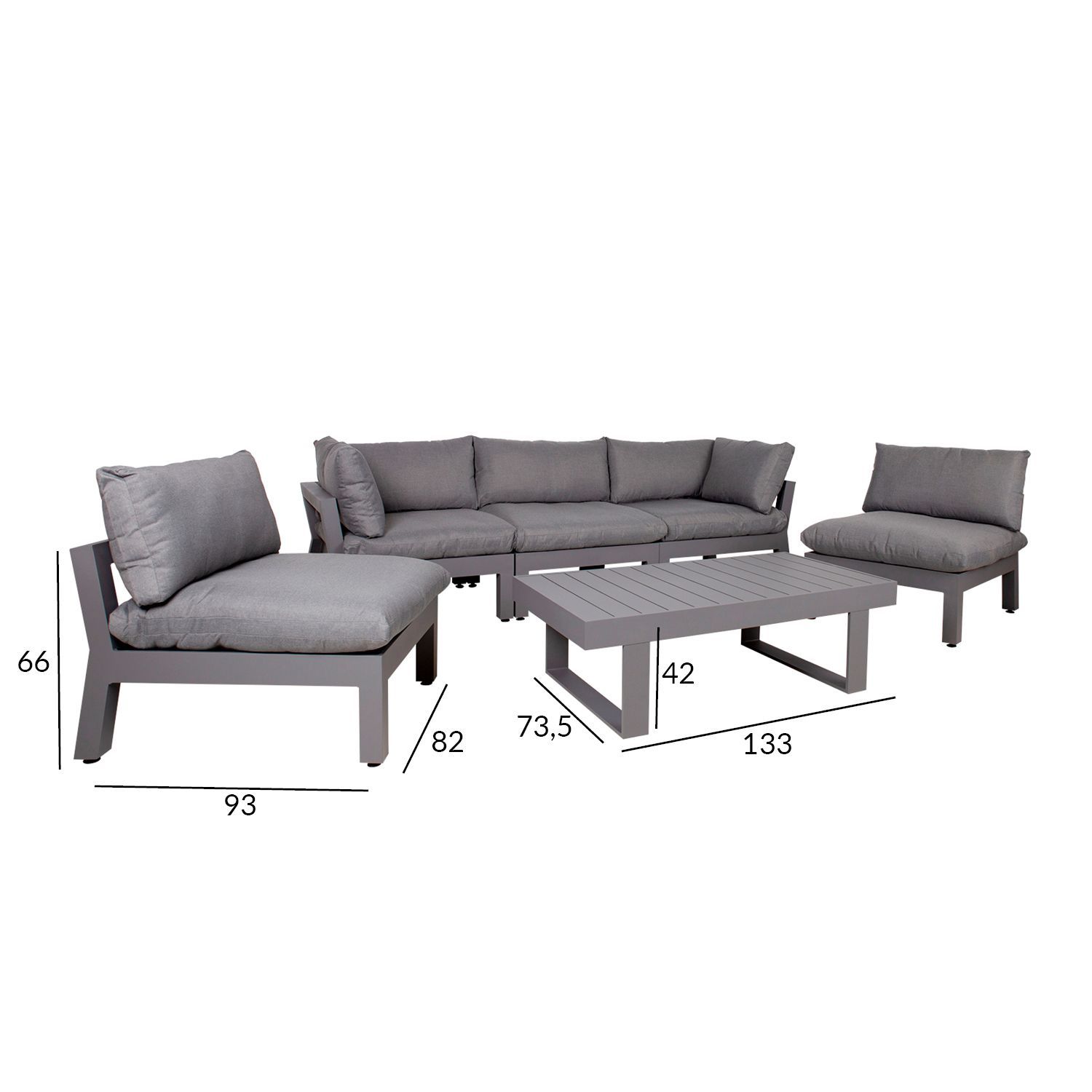 Aiamööblikomplekt FLUFFY mooduldiivan ja laud. Komplekti kuulub 2 nurgamoodulit, 3 vahemoodulit ja diivanilaud. Moodulite paigutust ja järjekorda on lihtne muuta. Diivani moodulite raamid ja laud on valmistatud alumiiniumist ja viimistletud halli pulbervärviga. Laua mõõdud on 133x73,5xH42cm. Nugamooduli mõõdud on 93x93xH66cm, vahemooduli mõõdud on 82x93xH66cm. Istmemoodulite põhjas on laiad põimitud rihmad, mida katab 3cm poroloonmatt. Paksud ja pehmed padjad ning elastne istmepõhi tagavad suurepärase istumismugavuse. Istme kõrgus raami ääreni on 35cm, koos padjaga 51cm. Istmepatjade mõõdud on 87x87xH16cm, seljatoepatjade mõõdud on 87x43x18cm, 72x43x16cm. Padjakatted on valmistatud hallist polüesterkangast. Padjakatted on eemaldatavad ja pestavad. Toode on muutlikes ilmastikutingimustes hästi vastupidav ja lihtsalt hooldatav. Kaitset ilmastikuolude eest vajavad ainult padjad. Hea lahendus patjade igapäevaseks hoiustamiseks ja kuivana hoidmiseks on padjakast. Välitingimustes kasutatava mööbli eluea pikendamiseks soovitame kasutada välimööbli katteid. HOIUSTAMINE: suvehooaja lõppedes soovitame aiamööblit hoiustada siseruumides. Puhastage ja kuivatage mööbel enne hoiule panekut. Kasutage hoiustamiseks kuiva ning hea ventilatsiooniga ruumi.
