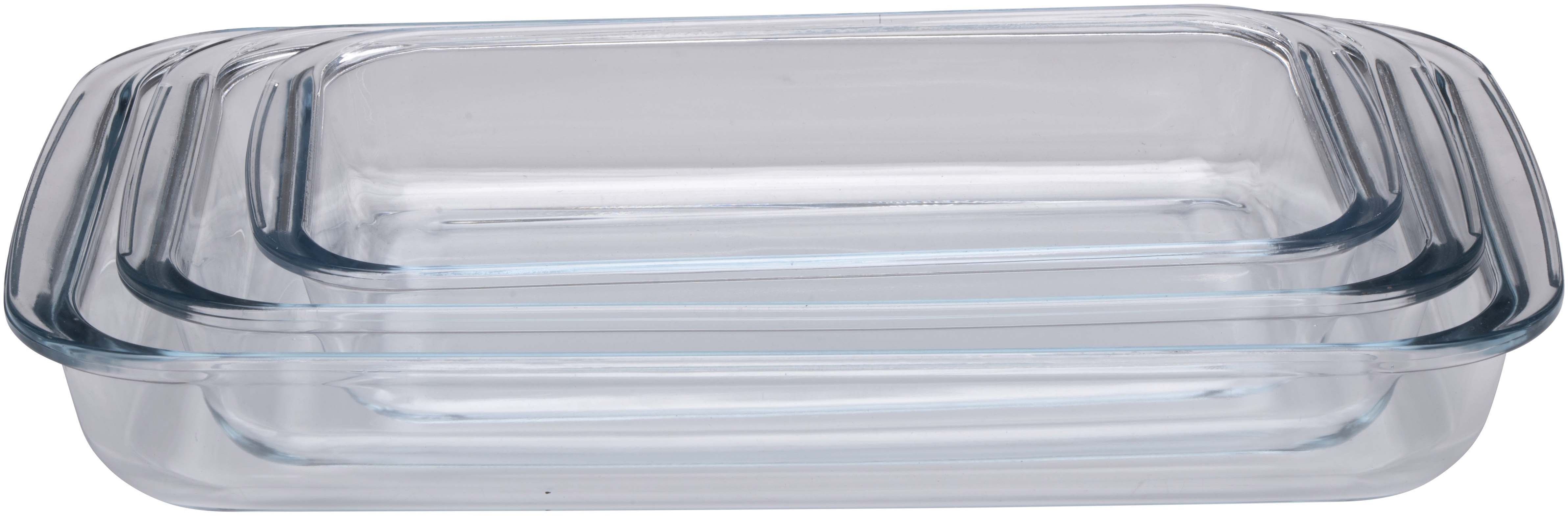 Alpina ahjuvormide komplekt 3 tk. Mõõtmed on 29,5 x 17,5 x 5 cm 1,6 l, 34,5 x 20,5 x 5 cm 2,2 l, 39 x 23,5 x 3 cm 2,9 l. Materjal: klaas.
